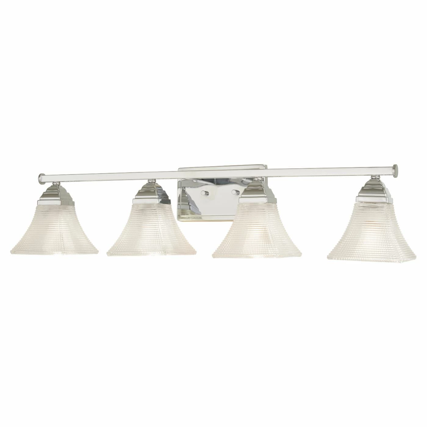 The wide shape of the Minka Lavery Conspire 4784-77 4 Light Bathroom Vanity Light is not only pleasing to look at, but having a vanity with such a wide shape is going to give you soft light from multiple sources, making it easier to see what you’re doing in the mirror. This vintage-inspired fixture is made from steel with a polished chrome finish. Four medium-base bulbs radiate with a warm light from behind square-shaped shades of textured glass. This fixture is suitable for modern and classic spaces alike, and it’s only rated for indoor use.