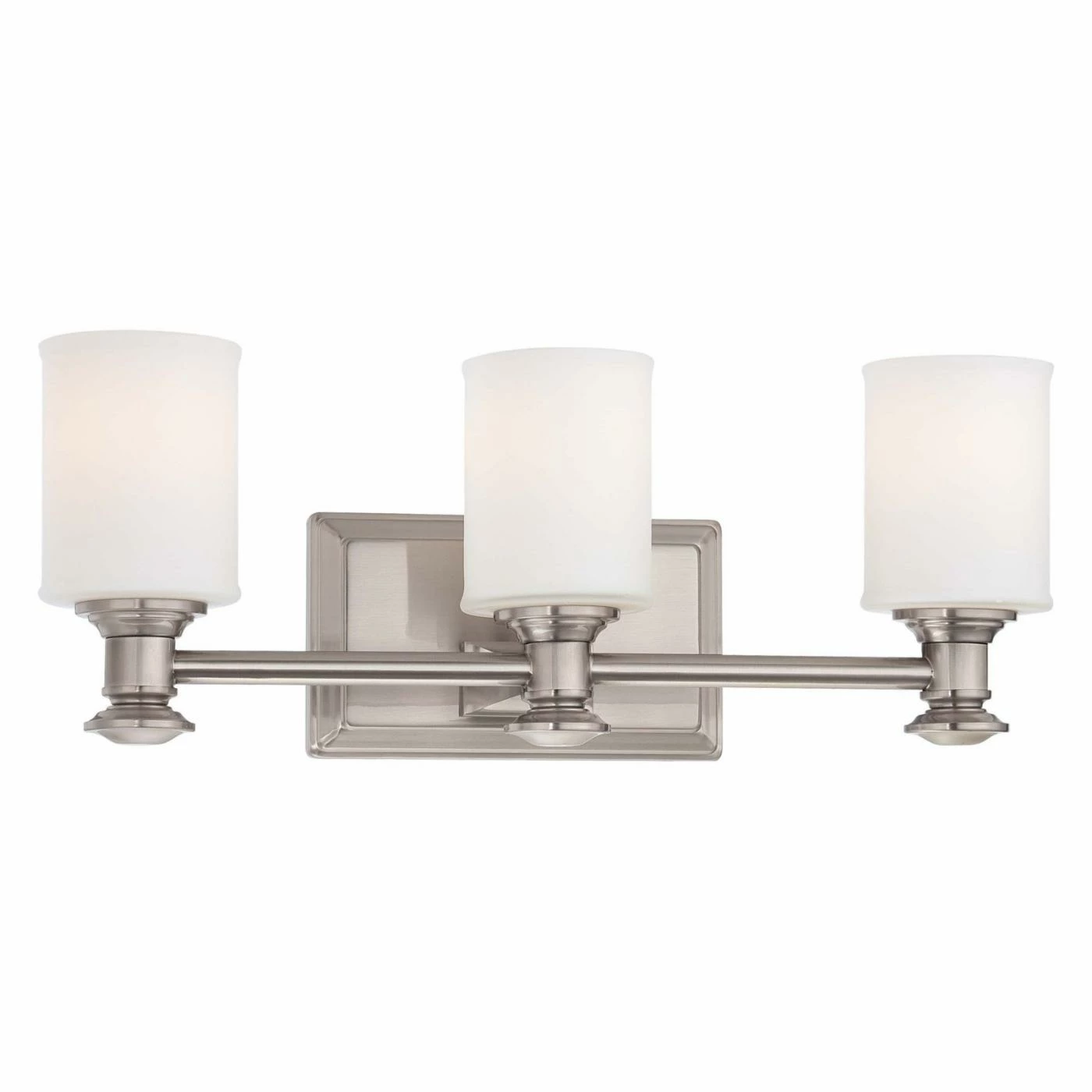 A trio white etched glass shades sit tall atop the Minka Lavery Harbour Point 5173-84 Bathroom Vanity Light. This vanity light boasts geometric style lines and a timelessly elegant brushed nickel finish.