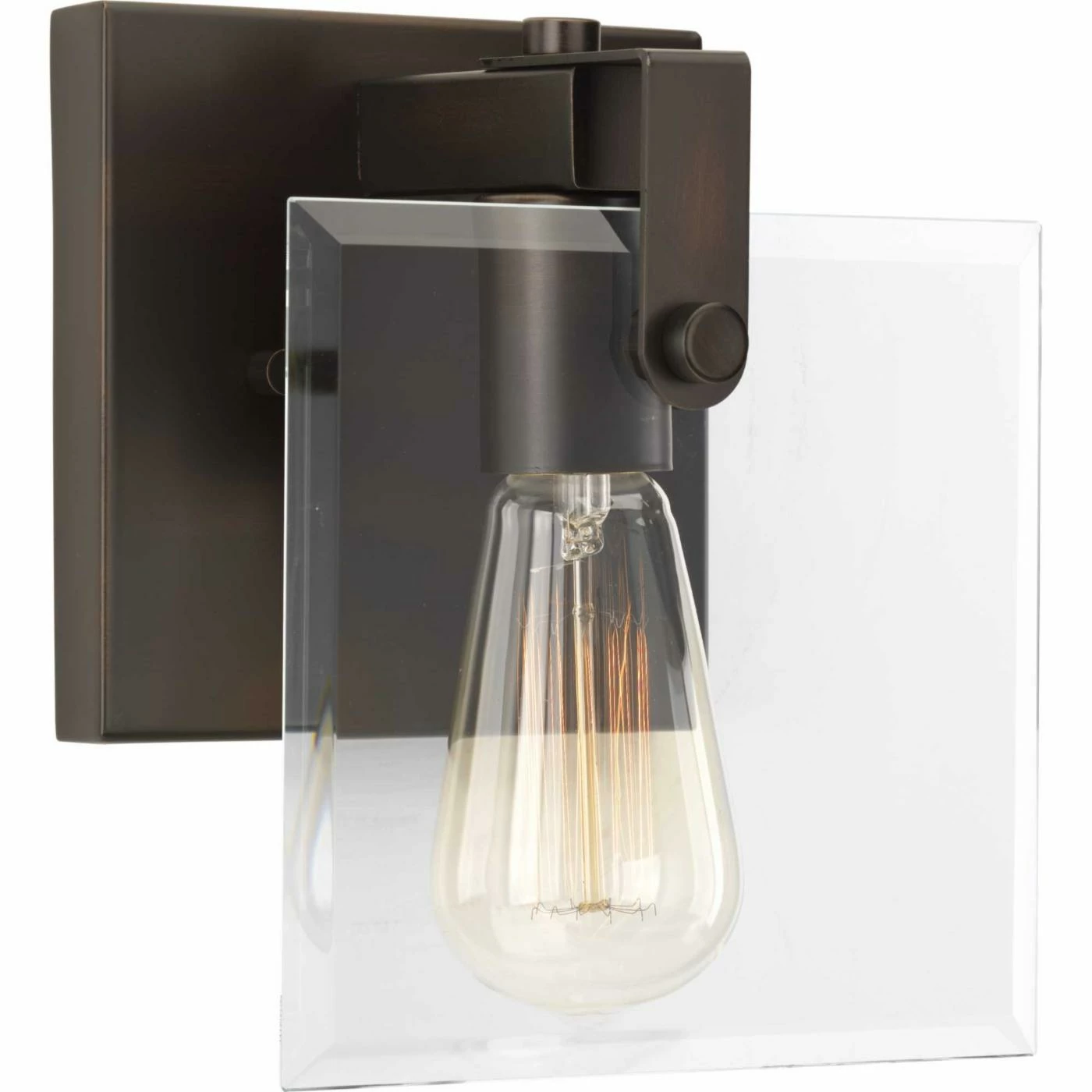 An exposed bulb is shielded by a transparent beveled glass square on the Progress Lighting Glayse Bathroom Sconce‘s rustic-chic design. The steel frame on this bathroom sconce arrives in your choice of available finish option to customize to your taste. This light fixture requires one 60-watt incandescent bulb that is not included.