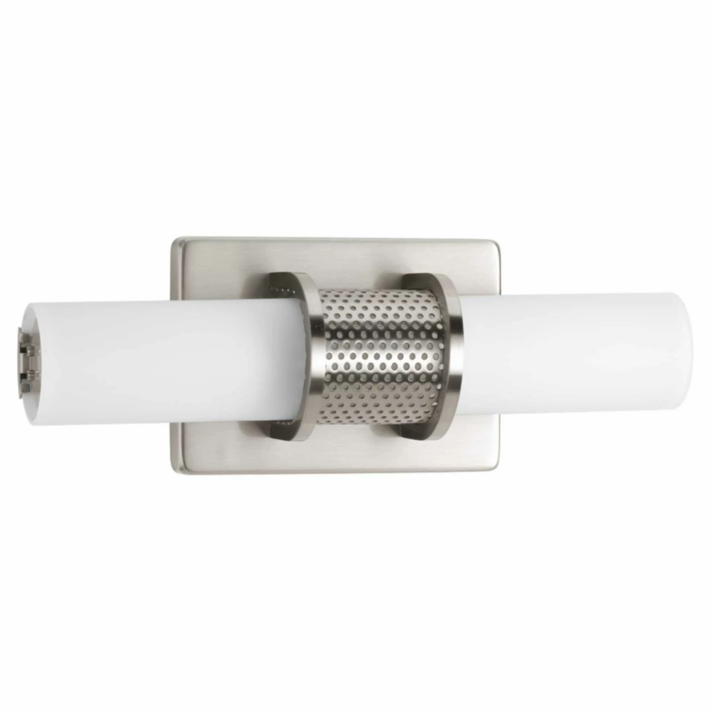 A cylinder glass shade in the Progress Lighting Truss 13 in. LED Linear Vanity Light‘s design reflects the light onto your entryway bench or hallway. The steel frame wraps around the white shade and has a small dot pattern in the middle. Choose from the available size and finish options to find the vanity light that fits into your room. This light fixture requires one 17-watt LED bulb that is included.