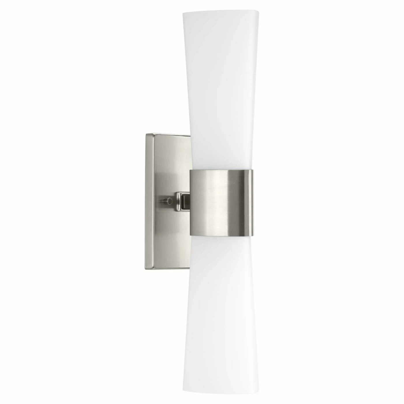 The Progress Lighting Zura 2 Light Bathroom Vanity Light‘s sleek design will light up your getting-ready space with elegance. The frame holds up two tapered glass shades on either end that are finished in white. The frame is constructed from steel and comes in your choice of available finish option. This light fixture requires two 60-watt incandescent bulbs that are not included.