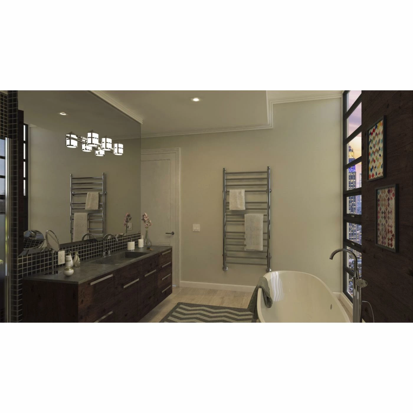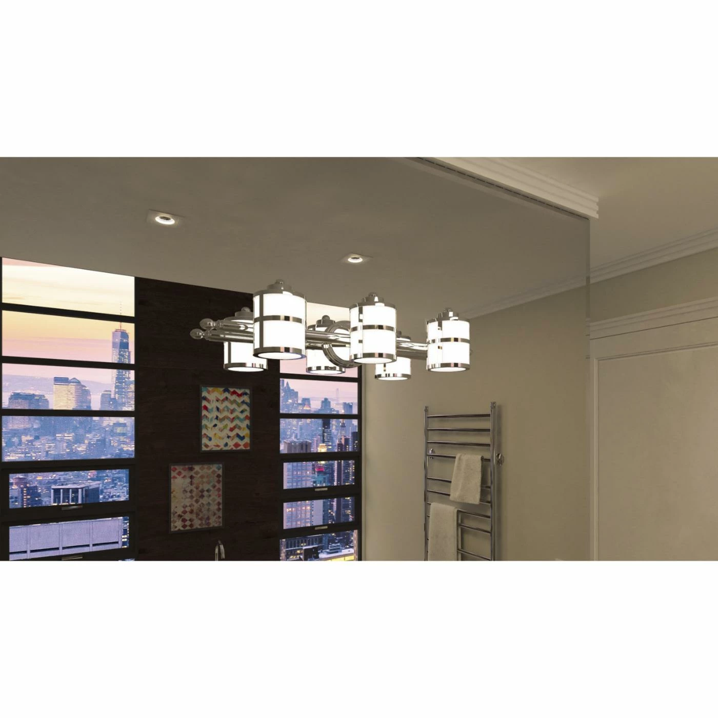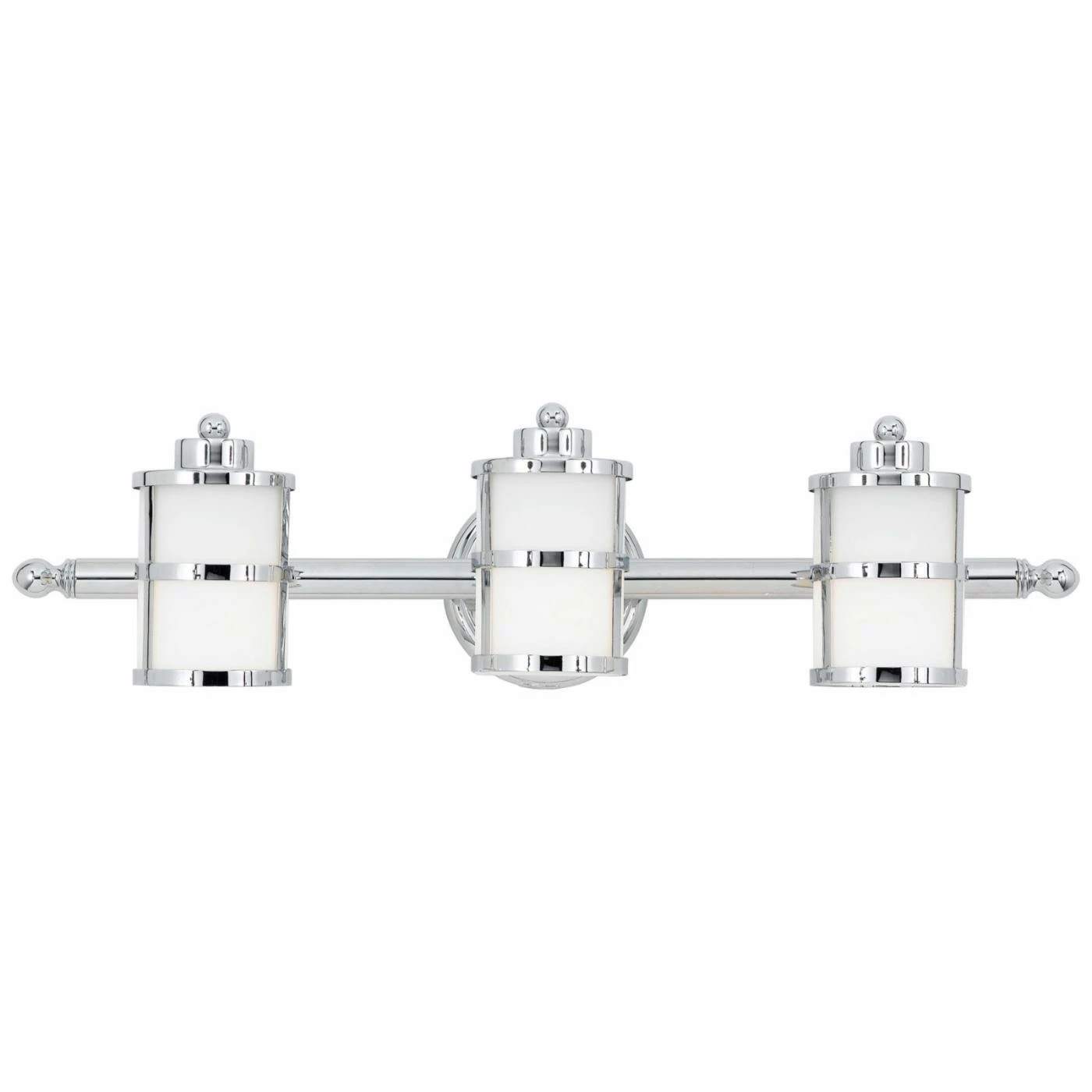 Reminiscent of the sleek designs of the Arts & Crafts movement, the Quoizel Tranquil Bay TB8603C 3 Light Bathroom Vanity Light has opal etched glass shades that will give off a subtle illumination. The shades are delicately held within a polished-chrome finished steel frame which adds to the contemporary styling of this fixture. With a 7-inch wall extension, it requires three 100-watt medium base bulbs (not included) and measures 26W x 6.5H inches.