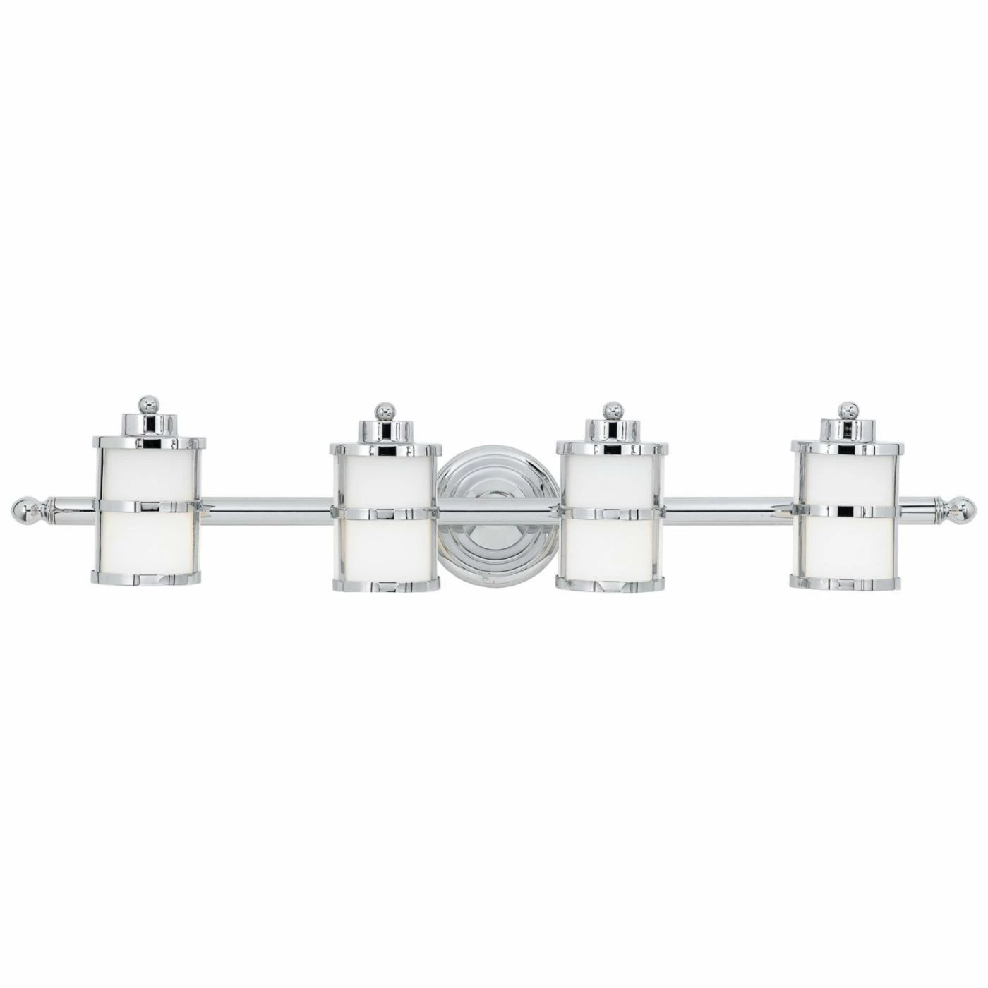 The Quoizel Tranquil Bay TB8604C 4 Light Bathroom Vanity Light draws inspiration from the sleek 20th century styling of the Arts & Crafts era. Requiring four 100-watt medium base bulbs (not included), this fixture features four opal etched glass shades that are gently cradled within a polished-chrome finished steel frame. It measures 34W x 6.5H inches and has a 7-inch wall extension.