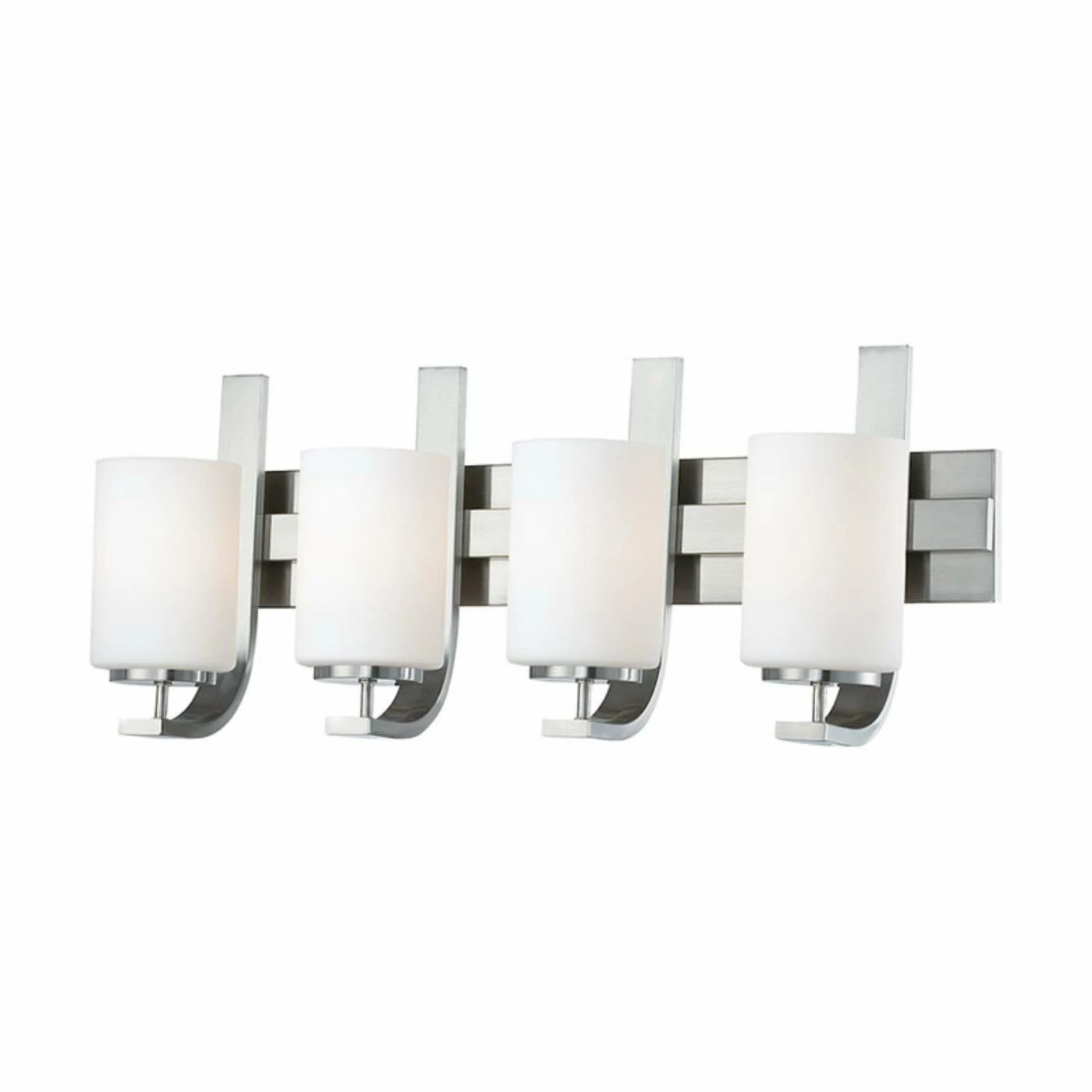 Bring attractive, soft ambient light to your contemporary bathroom with the Thomas Lighting Pendenza 4 Light Bathroom Vanity Light. Frosted glass shades diffuse the glow of the four uplights for a pleasing visual effect.