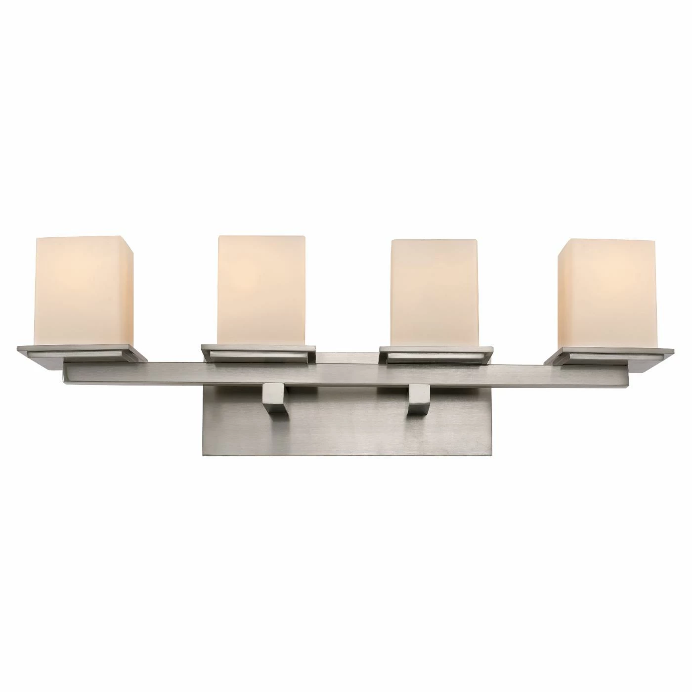 Give your bathroom warm illumination and contemporary style with the Trans Globe Lighting 20374 Downtown Square 4-Light Bathroom Vanity Light. This dramatic fixture features 4 square shades in frosted glass complemented by a modern style metal wall plate in your choice of available color options. Mount up or down to match your taste. Requires three 60-watt medium E-26 type A bulbs (not included).