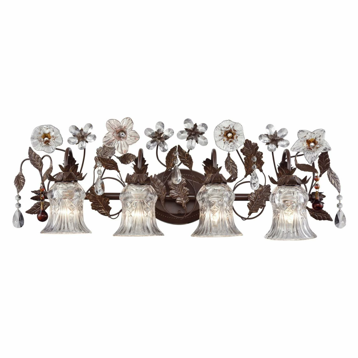 Adorn your wall in intricate elegance with the ELK Lighting Cristallo 7048/4 Bathroom Vanity Light. This elaborate vanity light features four crystal glass shades and shimmering floral accents framed by leaves. The base of this light is crafted of sleek metal and painted in a deep shade of rust, creating a natural, woodsy element.