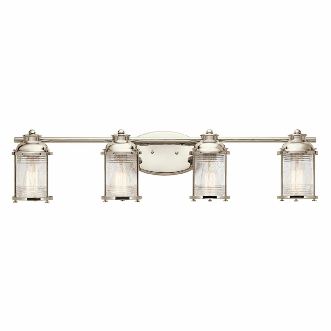 The Kichler Ashland Bay 45773 Vanity Light brings retro-style beauty into your bathroom with four nautical-inspired fixtures that hold a seeded glass shade. This truly unique light is finished in polished nickel that helps give it an elegant touch.