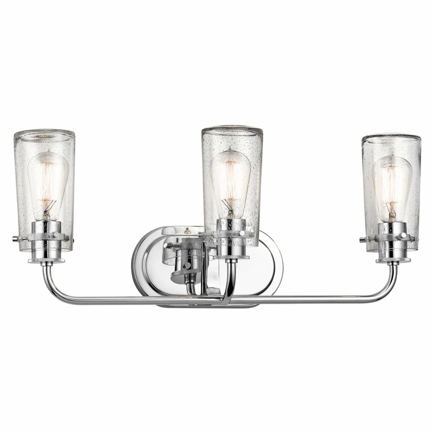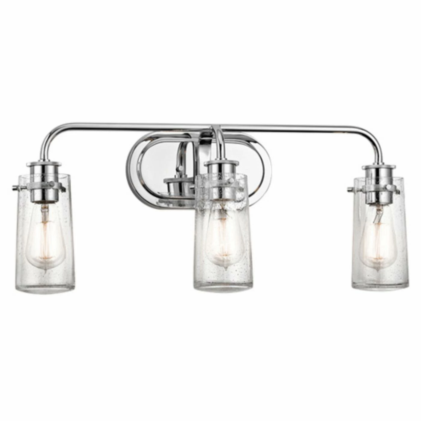 Great for displaying in a bathroom, this Kichler Braelyn 45459CH Bathroom Vanity Light provides brilliant illumination and a clean aesthetic. Crafted of strong steel, it’s finished in a gleaming brushed nickel and boasts glass shades. Requires three 100-watt bulbs, not included.