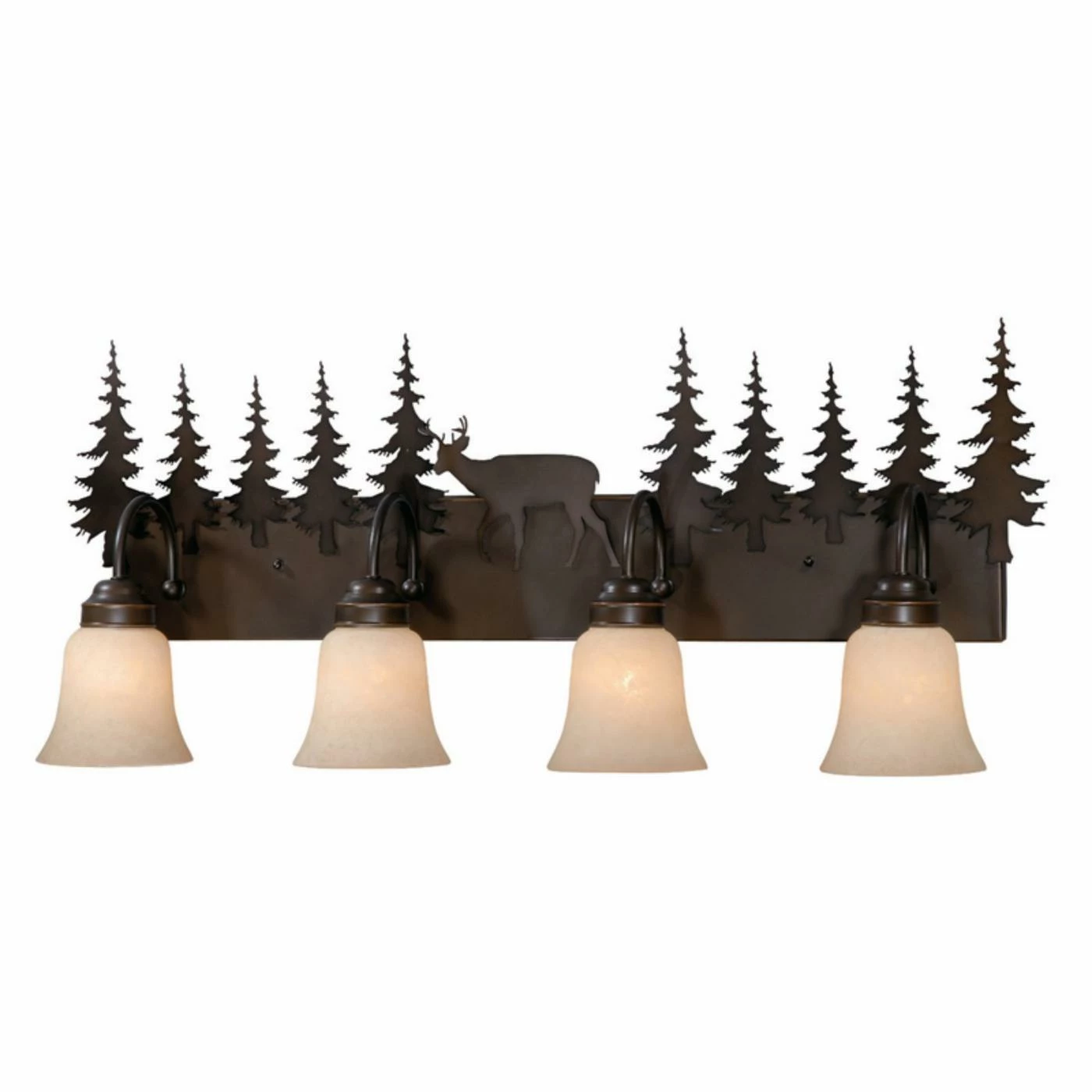 As a fixture or even as an accent piece, the Vaxcel Bryce 4-Light Vanity – 33W in. Burnished Bronze is going to make a subtle yet pleasing change to your home. The rustic motif of this fixture is crafted from metal with a bronze-hued finish that is nicely set off by the quartet of amber flake glass shades. Each shade uses a 100-watt, medium-base bulb, emiting a cozy and diffuse light thatβs perfect for bathroom use. This fixture is damp-rated and suitable for use in any room in your home.
