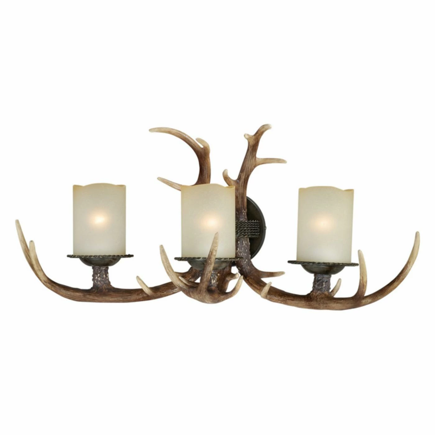 Perfect for cabin houses, the Vaxcel Yoho W0046 3 Light Bathroom Vanity Light makes a woodland statement within your bath. This unique vanity light showcases a black walnut finish, three antler pieces, and crème cognac glass shades. This bathroom vanity light requires three 100-watt medium bulbs (not included).