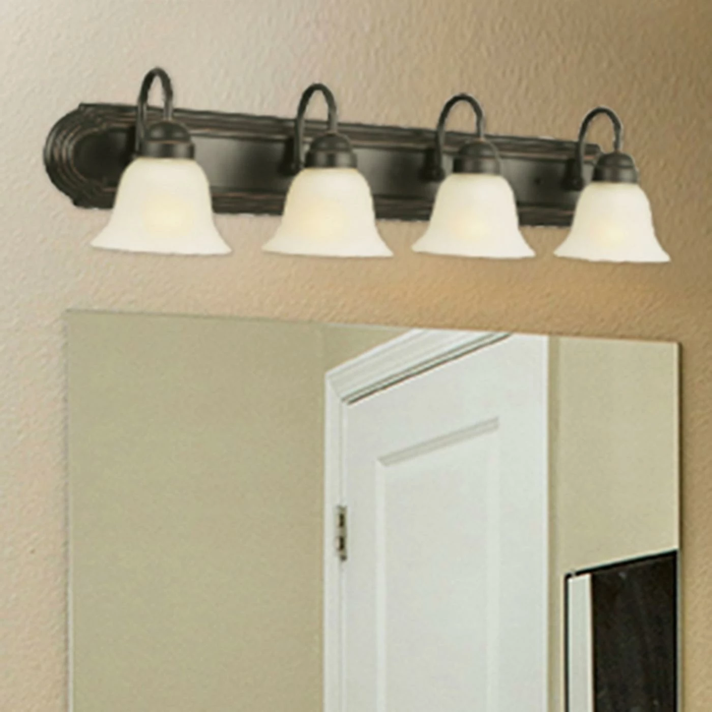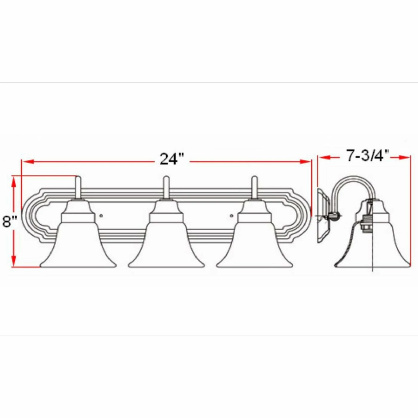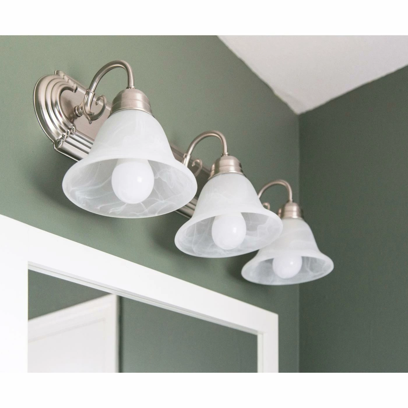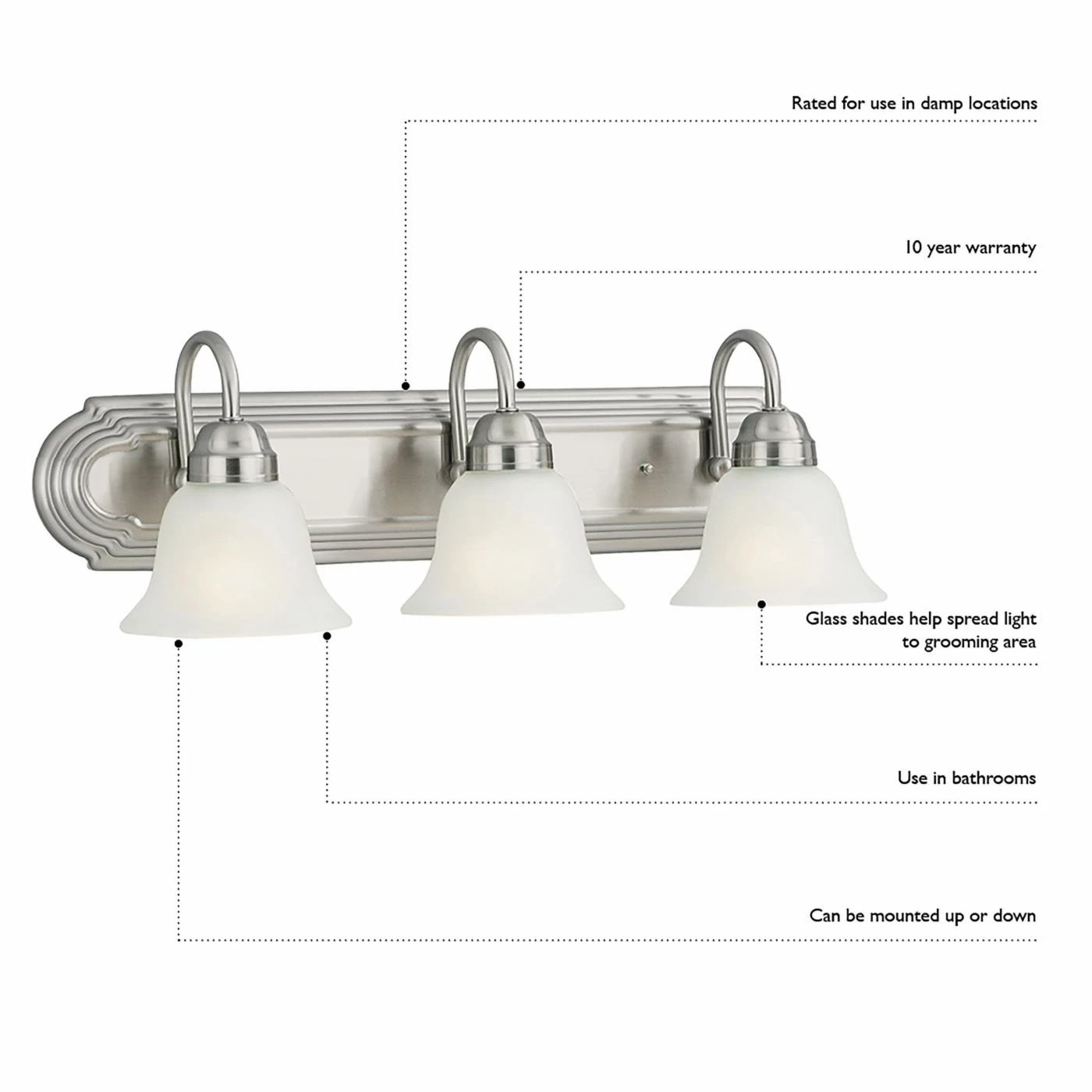Customize your master- or half-bathroom vanity with some new overhead lighting in the Design House Allante 3 Light Bathroom Vanity Light. This wall-mounted light can be installed with its sockets facing up or down as desired. Thick metal constructs the mounting plate and socket arms, finished in your choice of available color option. Each socket is rated for a 60-watt bulb (not included) and comes with a frosted glass tulip shade. The unit is UL-listed and damp-rated for bathroom or kitchen installation.