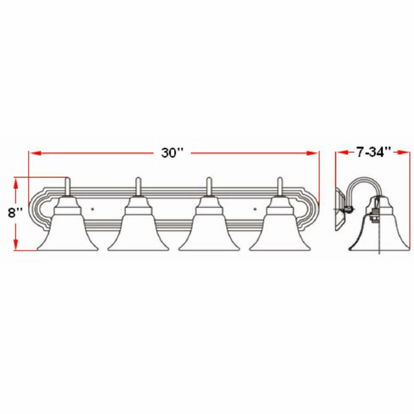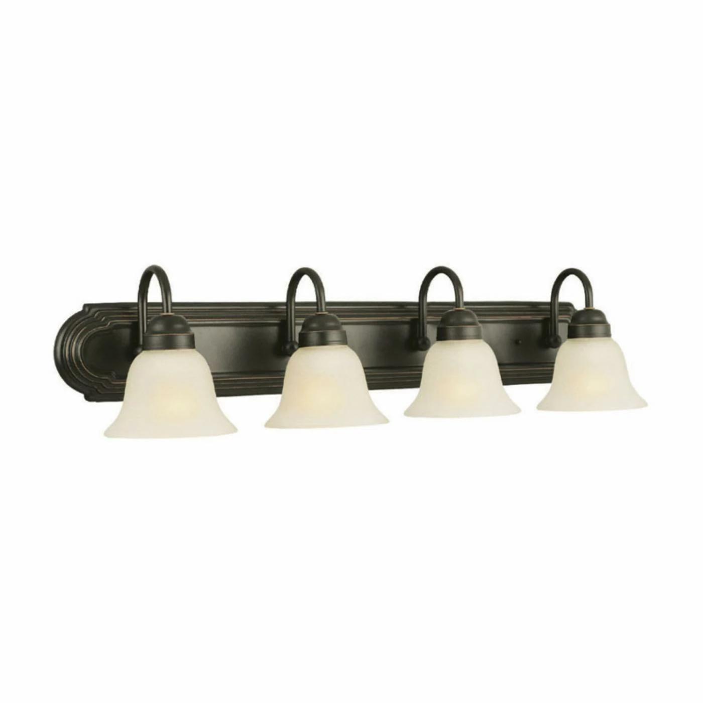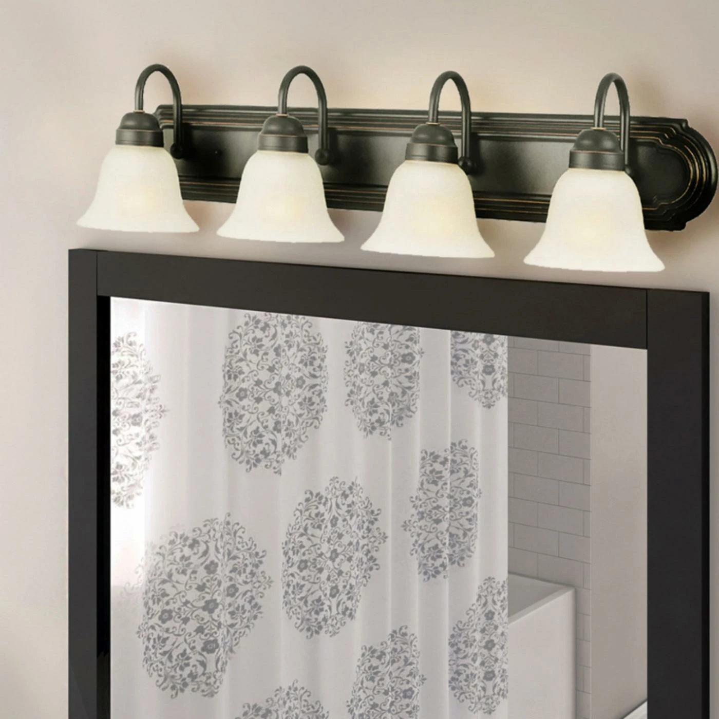 Give your bathroom vanity a much-needed update with the Design House Allante 4 Light Bathroom Vanity Light. This vanity light has a classical look with a wide, oval-shaped backing plate made from metal with raised, molded edges and an oil-rubbed bronze finish. Four 60-watt sockets are built into the design, featuring curved arms and frosted-glass tulip shades. The unit is UL-listed and damp-rated. Bulbs are not included.