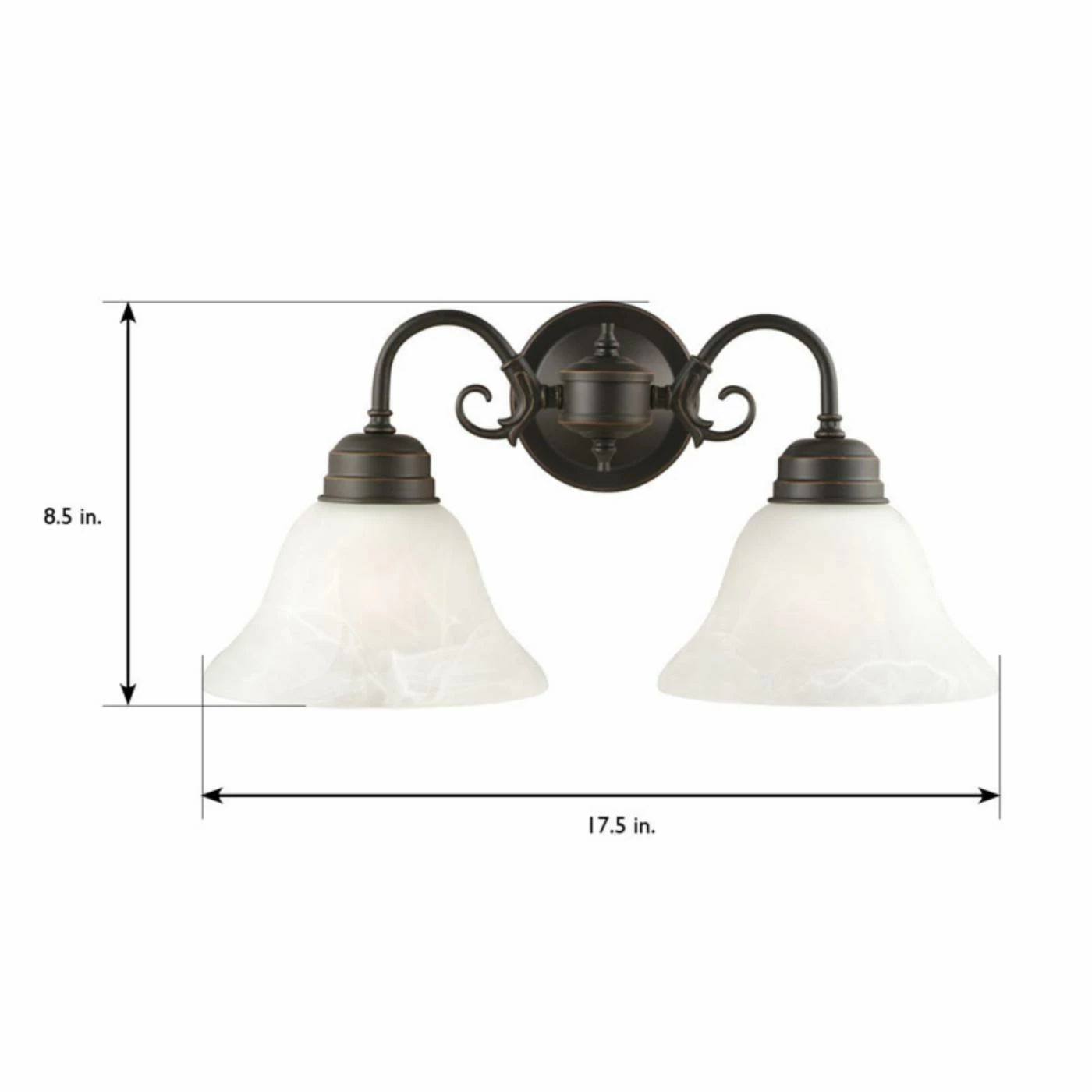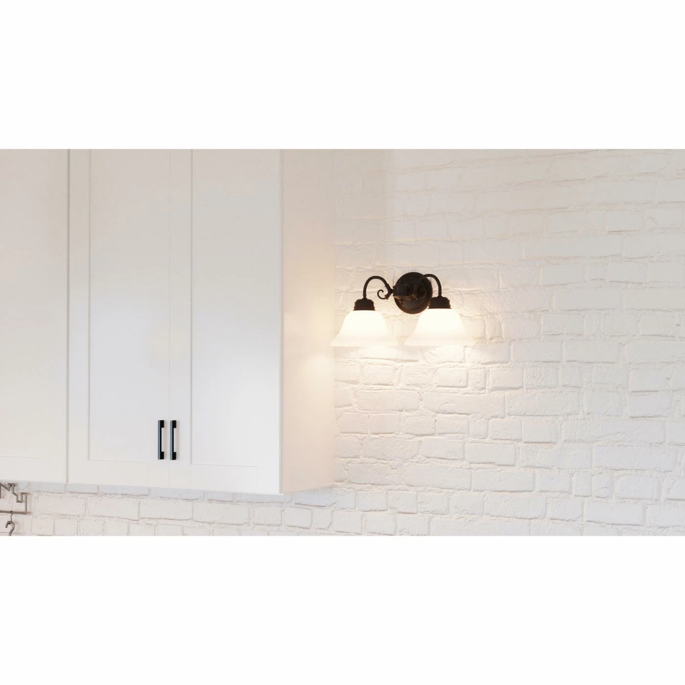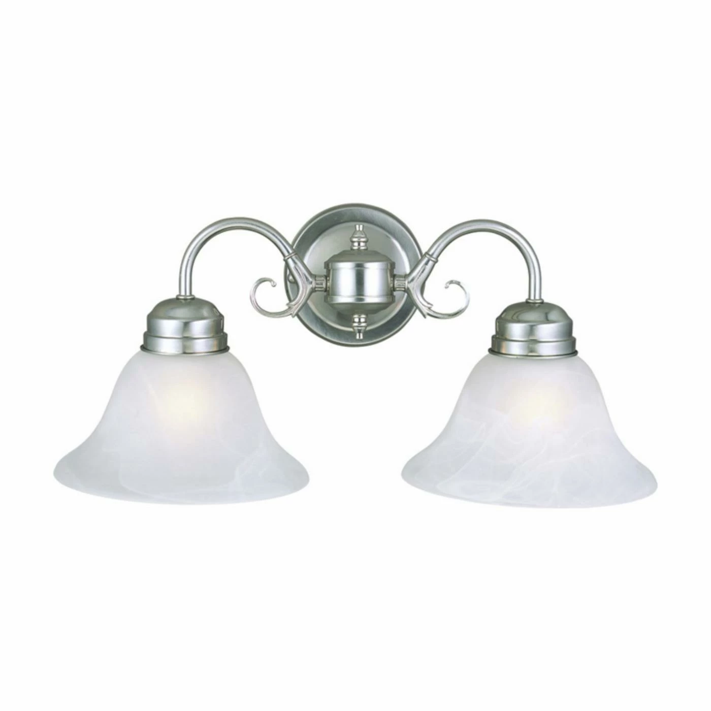 Give your bathroom an elegant classical makeover with the Design House Millbridge 2 Light Bathroom Vanity Light. This two-socket sconce is perfect for your single vanity, made from steel and damp-rated for bathroom use. The 60-watt sockets have frosted glass tulip shades and are mounted to the round backing plate by scrolled arms. Install the lights facing up or down as desired. Match the light to your dΓ©cor by choosing from the available finish colors. Bulbs are not provided.
