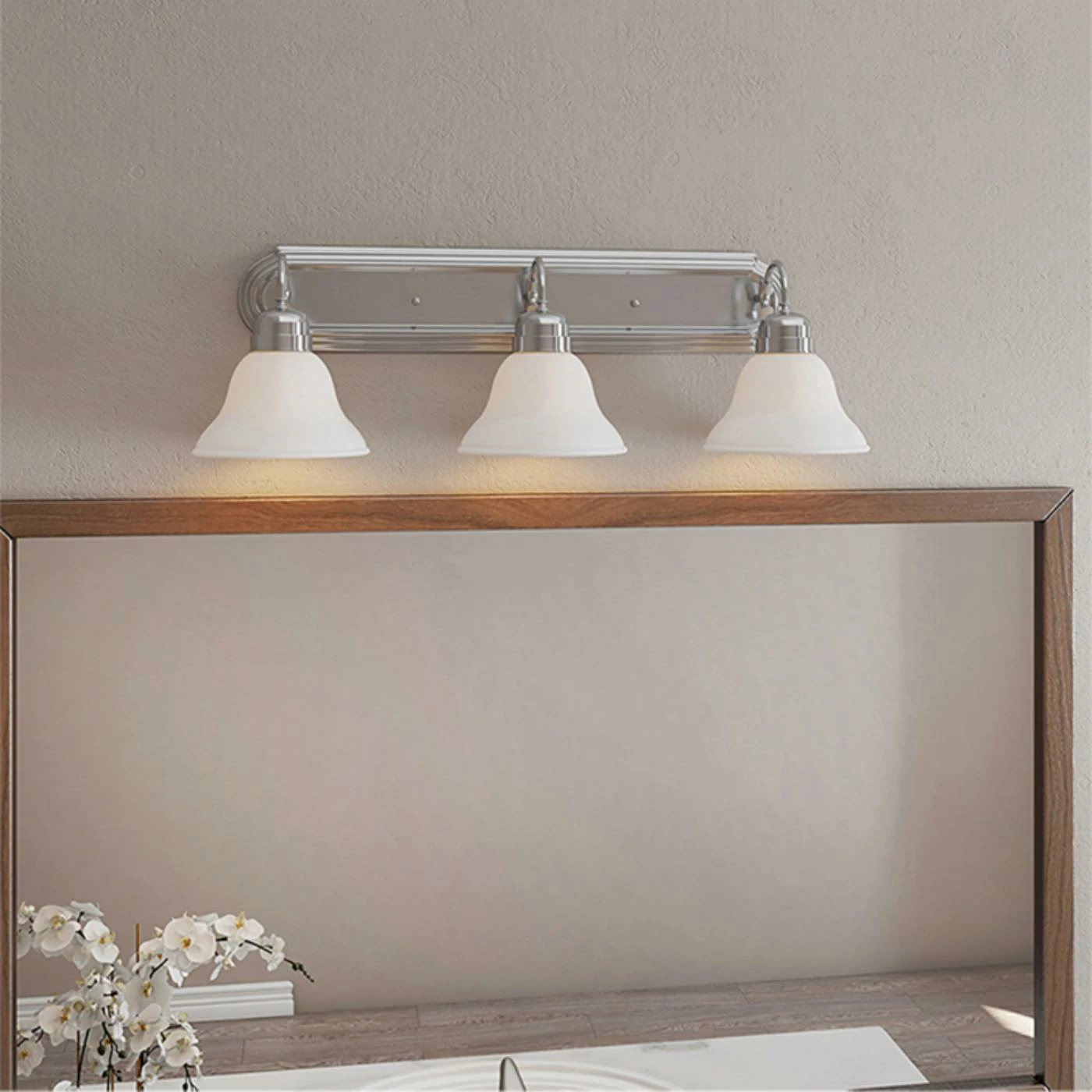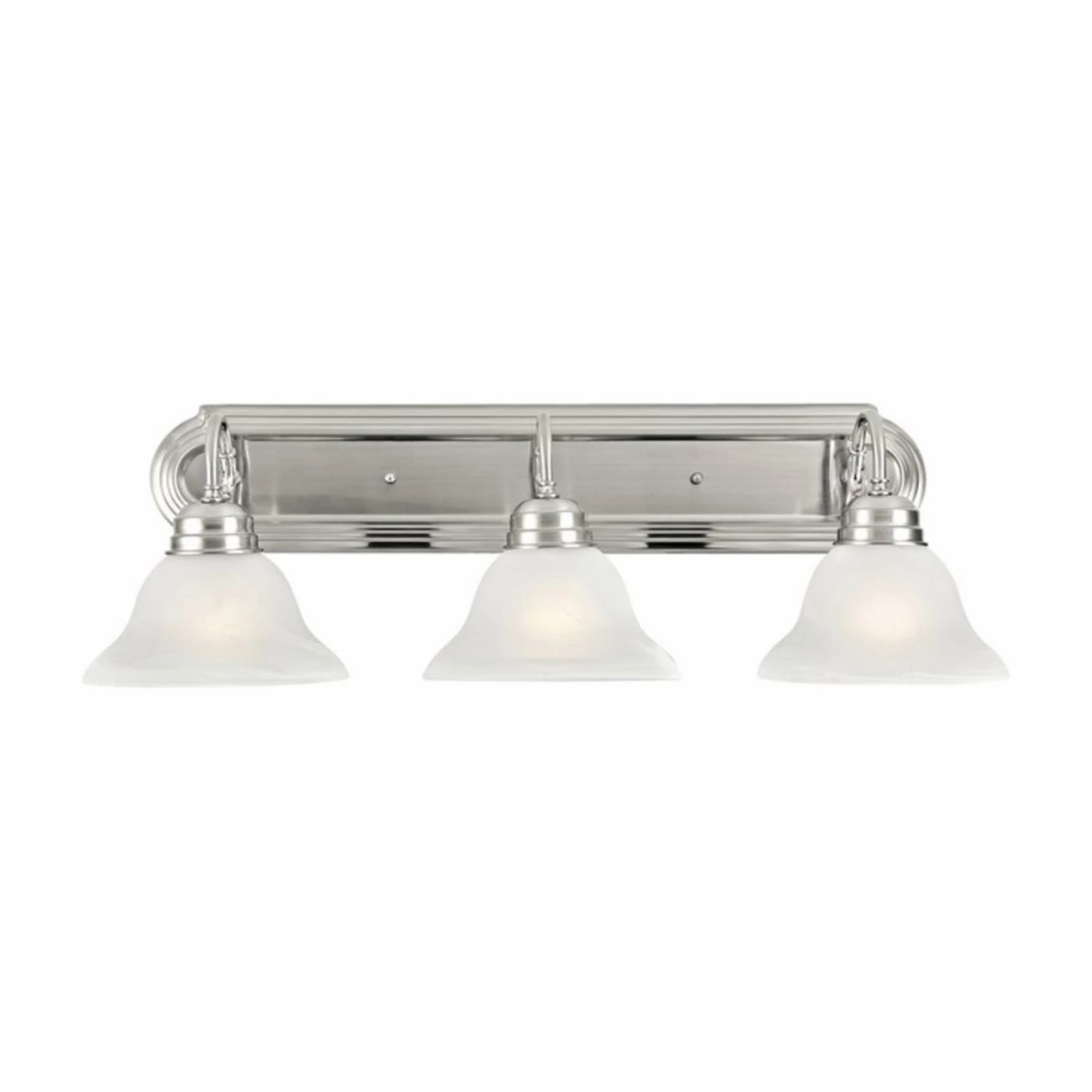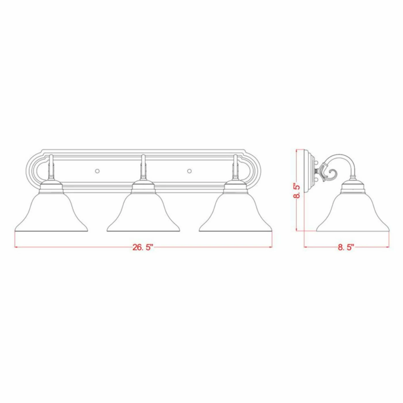Afford your bathroom a classical update with the Design House Millbridge 3 Light Bathroom Vanity Light. This vanity light has three curved-arm sockets and is supported by a tough steel frame. Install the lights facing upwards or downwards as you prefer. Each socket is rated for a 60-watt bulb and comes with a frosted-glass tulip shade. Choose your preferred finish option from the available colors.