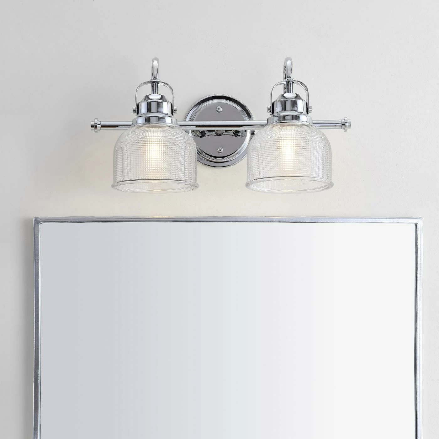 Complete with clear glass shades, the JONATHAN Y JYL Virginia 2 Light Vanity Light lends brilliant illumination to your vanity space. The shades of this vanity light feature a textured pattern that elevates this light’s visual intrigue. The metal base of this vanity light features a chrome finish that gives it a sleek look with a dose of shine.
