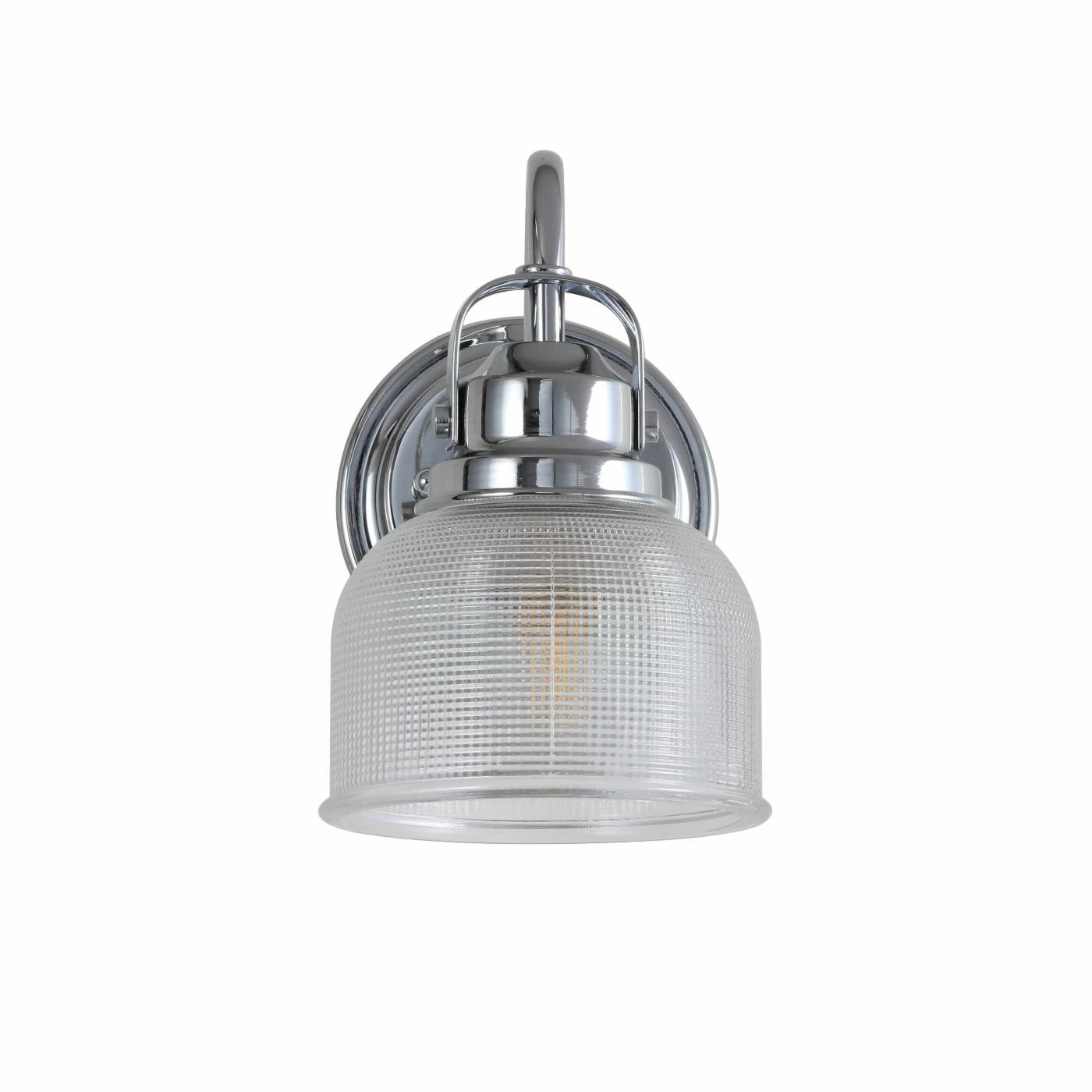 - Chrome-finished metal construction with textured glass globe
