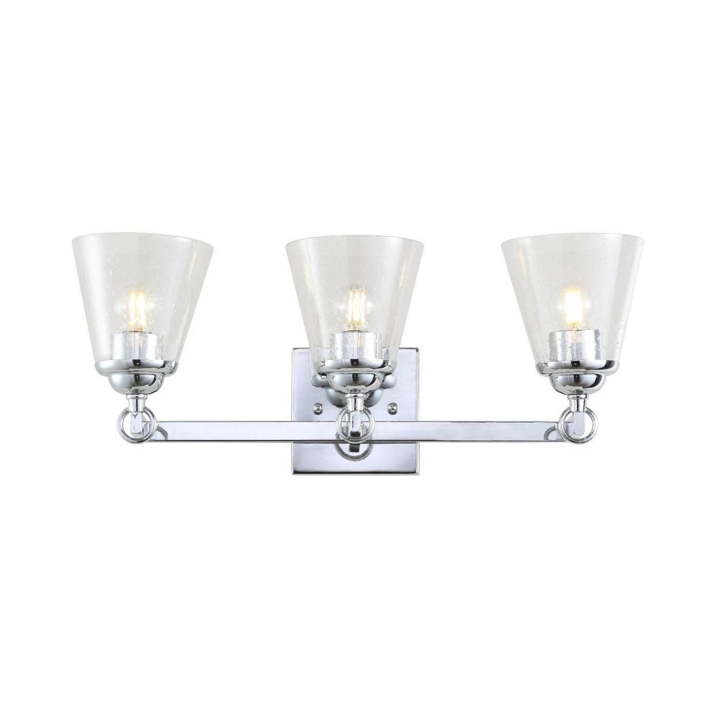 Designed to efficiently brighten your bathroom or vanity area, the JONATHAN Y Marion 3 Light Vanity Light is equipped with a trio of bulbs. Each glass shade of this vanity light showcases a seeded design with clear walls that allow clear, crisp lighting. Install this vanity light in an upward position to reflect the lighting against the ceiling, or mount it in a downward direction to focus the lighting on your vanity countertop.