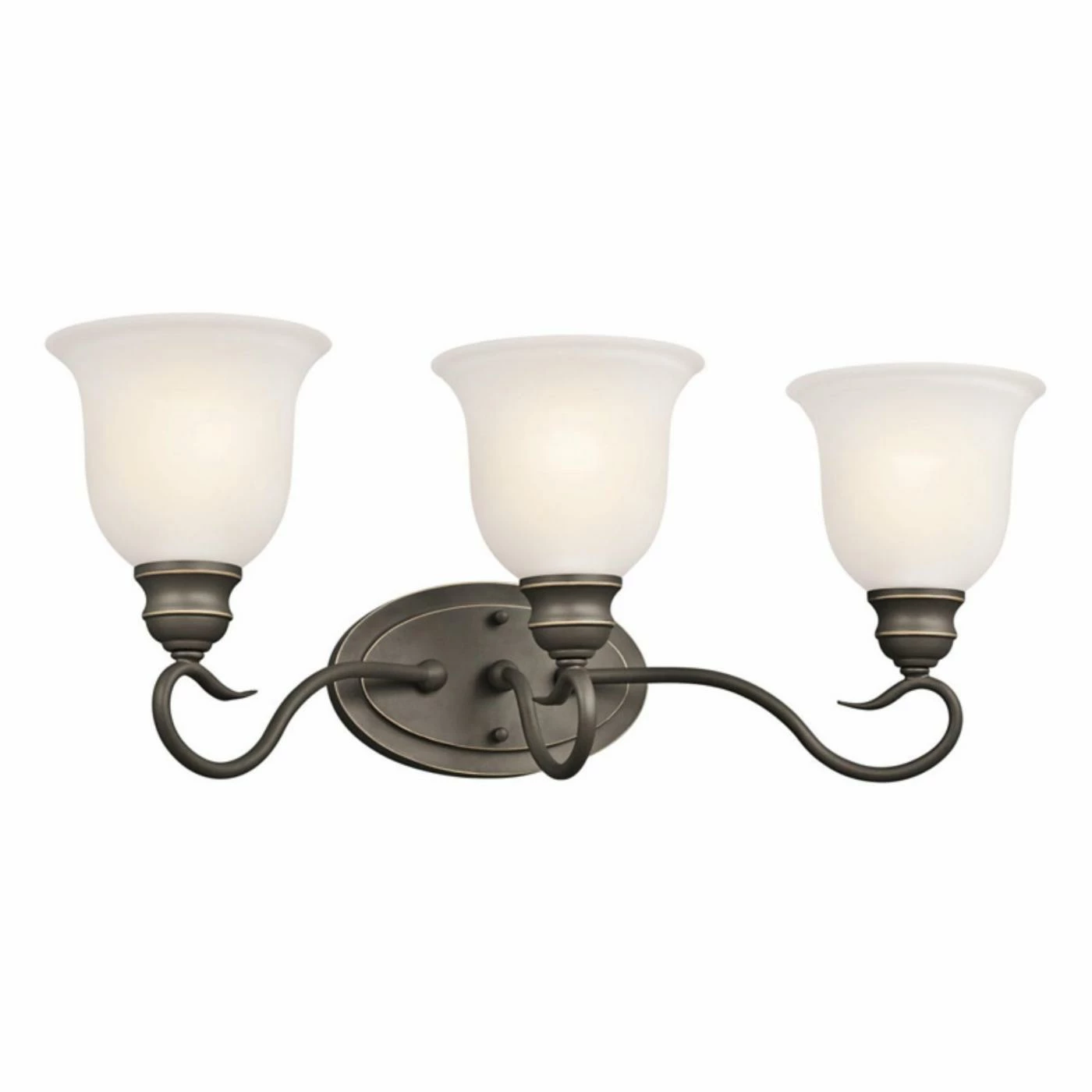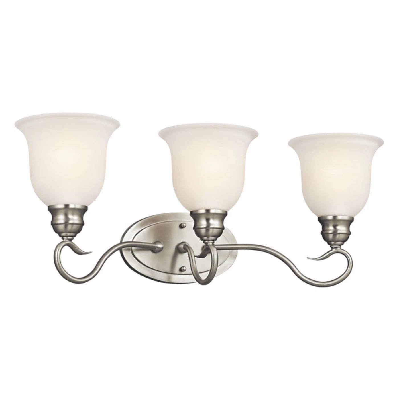 Infuse charm and grace into any living space with the Kichler Tanglewood 45903 Vanity – 23.25 in. The elegant three-lamp vanity light has etched glass that will provide a welcoming appeal to your private space. Because itβs designed in a transitional style, the chic light accessory will enhance the decor style of traditional as well as contemporary homes. Enjoy a relaxing ambience in the shower and bath area with this trendy light option in your living space.