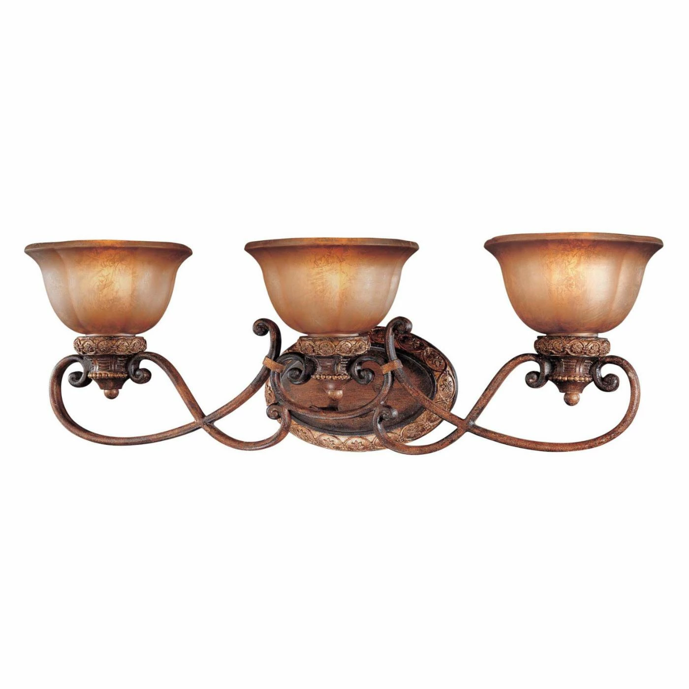 Part of a collection of light fixtures inspired by Hearst Castle, the Minka Lavery Illuminati 6353-177 Bathroom Vanity Light has an opulent look truly worthy of any royal bathroom. The steel fixture brings a warm glow and rich color to interiors with its Illuminati bronze finish and silver patinated glass shades. Three uplights are included in the design and positioned on sophisticated scrollwork arms.