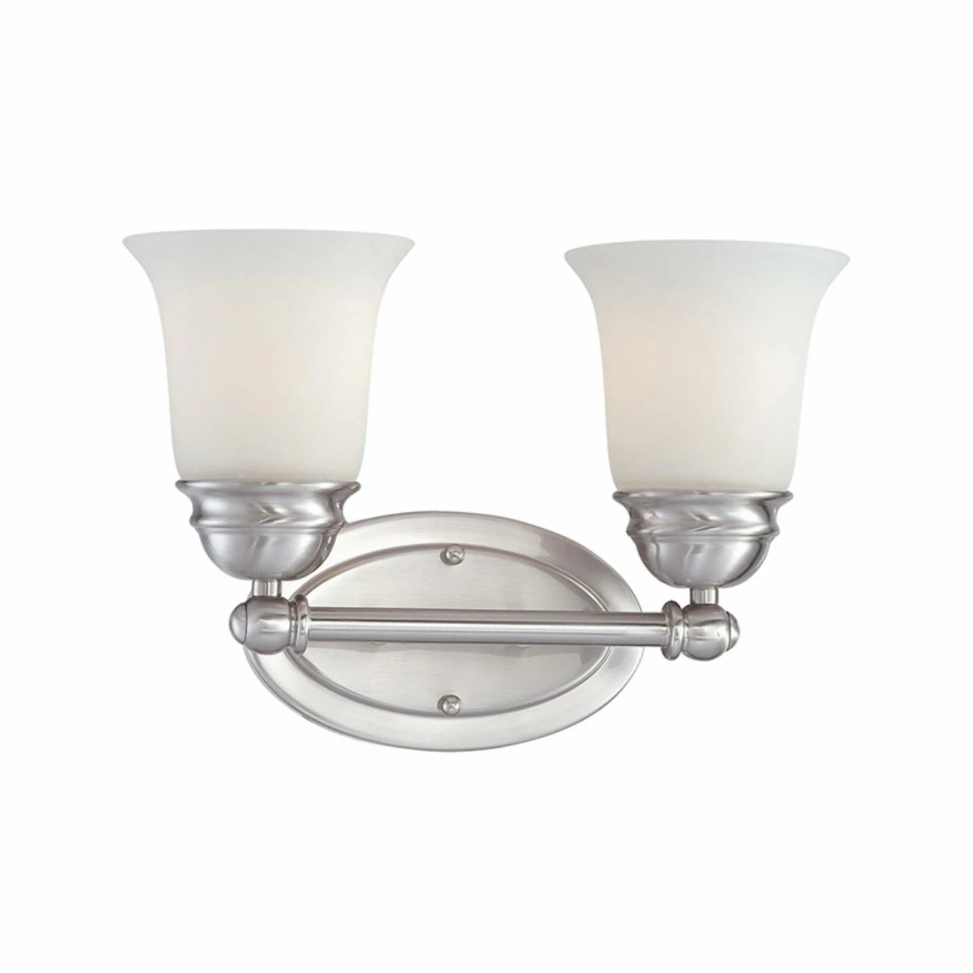 Brighten up your traditional bathroom with the Thomas Lighting Bella 2 Light Bathroom Vanity Light. The timeless vanity light features two frosted white glass trumpet shades mounted on a metal bar attached to an elegant, stepped oval backplate.