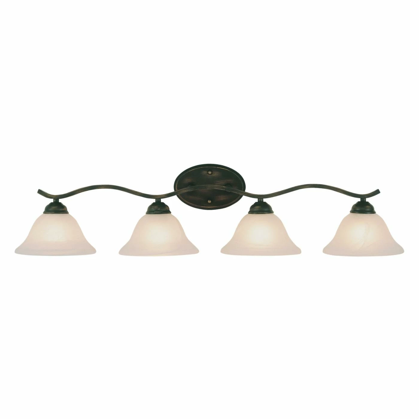 The gentle curve of the main bar provides a solid home for the four marbleized glass lights that will make the Transglobe 2828 ROB Bath Bar – Rubbed Oil Bronze – 35W in. a must-have item in your bath. Each light conceals a 100-watt medium base bulb and the oil-rubbed bronze finish is subtle enough to fit easily alongside most styles of bathroom decor.
