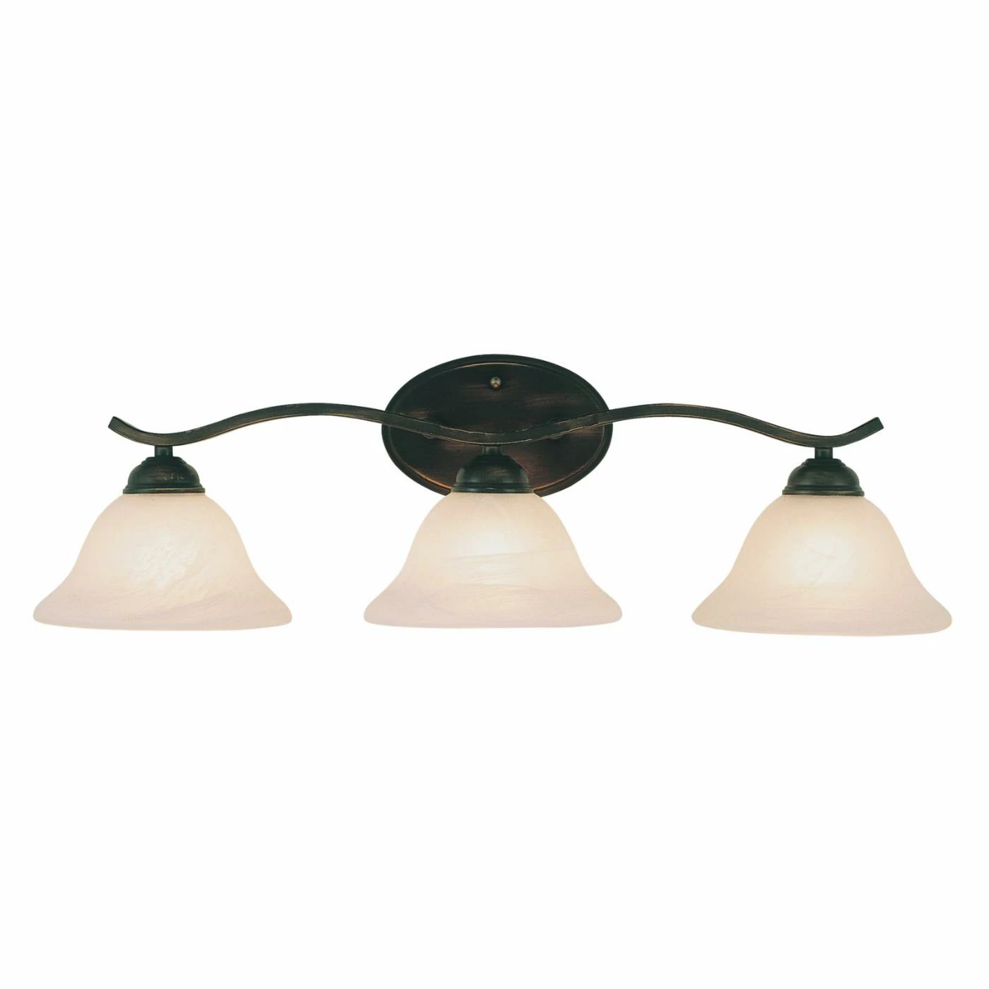 Illuminate your bathroom in style with the Transglobe 2827 ROB Bath Bar – Rubbed Oil Bronze – 26W in.. This light fixture features a wavy metal bar and oval backplate richly finished in a rubbed oil bronze. It has a casual transitional style that works well in contemporary or traditional spaces. Marbleized glass shades have an elegant bell shape and can be mounted up or down depending on your lighting needs. This vanity light requires three 100-watt medium base bulbs (not included).