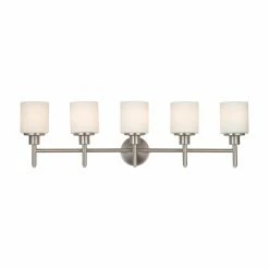 Outfit your bathroom with both impressive and pleasant illumination with the Design House Aubrey 5 Light LED Bathroom Vanity Light. This vanity light features a steel base that’s topped in a gleaming satin nickel finish. Its base is attractively paired with five frosted glass shades that gently diffuse light. This fixture’s clean lines and smooth finishes make it a winning selection for your home. It includes five LED bulbs.