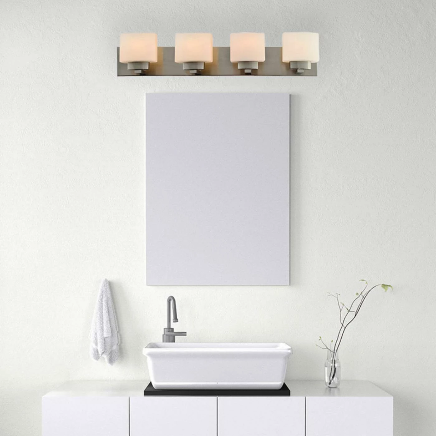 Celebrate modern minimalism with the Design House Dove Creek 4 Light Bathroom Vanity Light as your new bathroom light source. The light is crafted from steel with a gorgeous satin nickel finish. Four squared sconce sockets support 60-watt bulbs, each paired with frosted off-white glass shades. The light is damp-rated. Bulbs are not included.