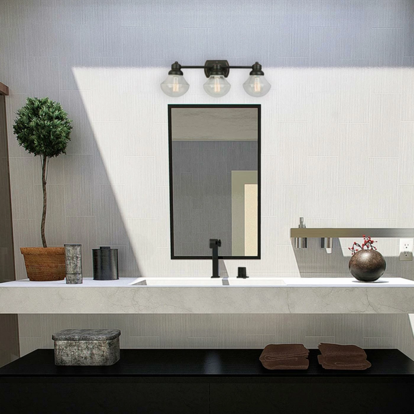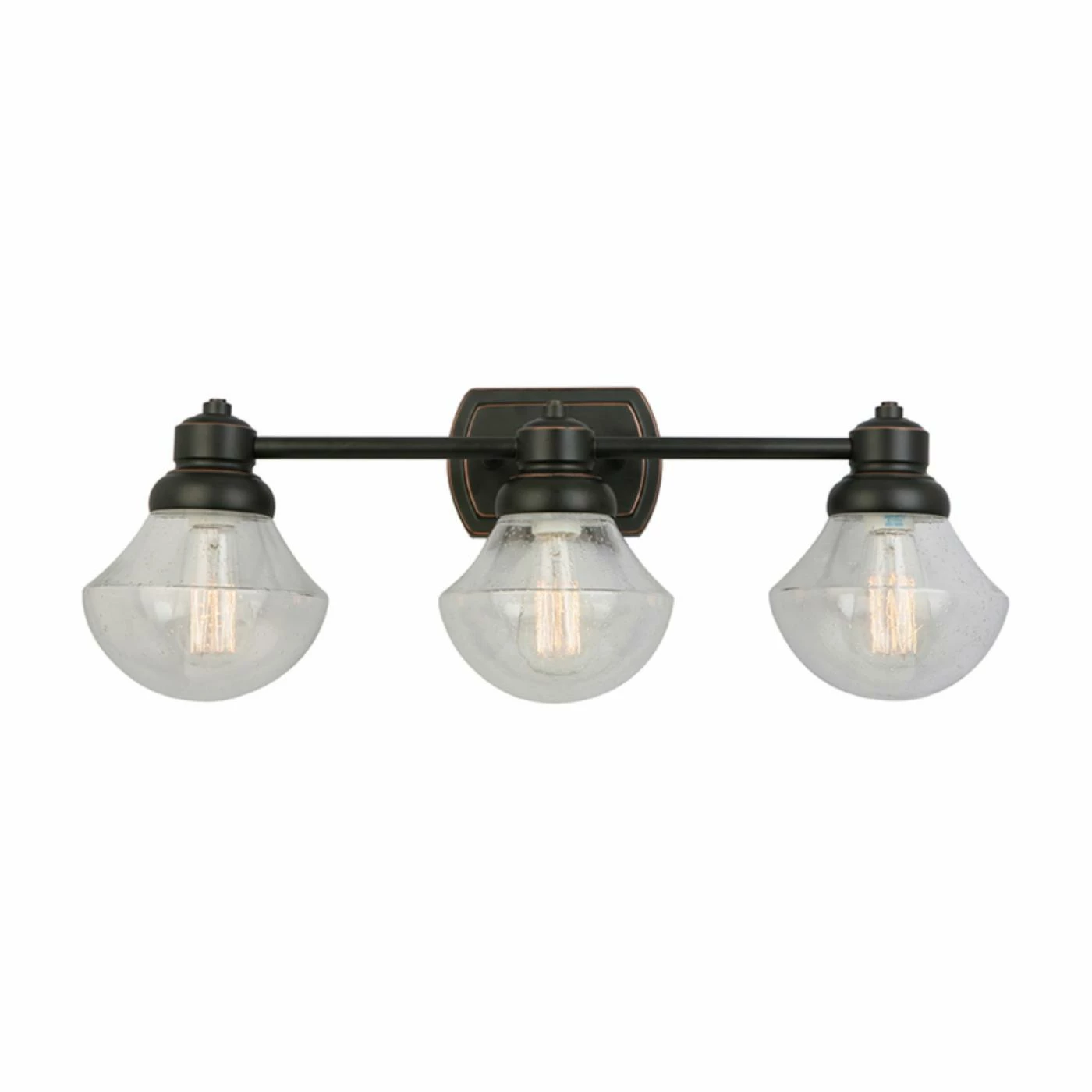 Introduce some vintage allure to your bathroom with the Design House Sawyer 3 Light Bathroom Vanity Light. Thick steel constructs the frame, finished in oil-rubbed bronze. The sockets are intended for 60-watt warm bulbs and may be installed up or down. Seeded clear glass shades are included, adding to the vintage look. The unit is damp-rated for use in bathroom and kitchens. Bulbs are not included.