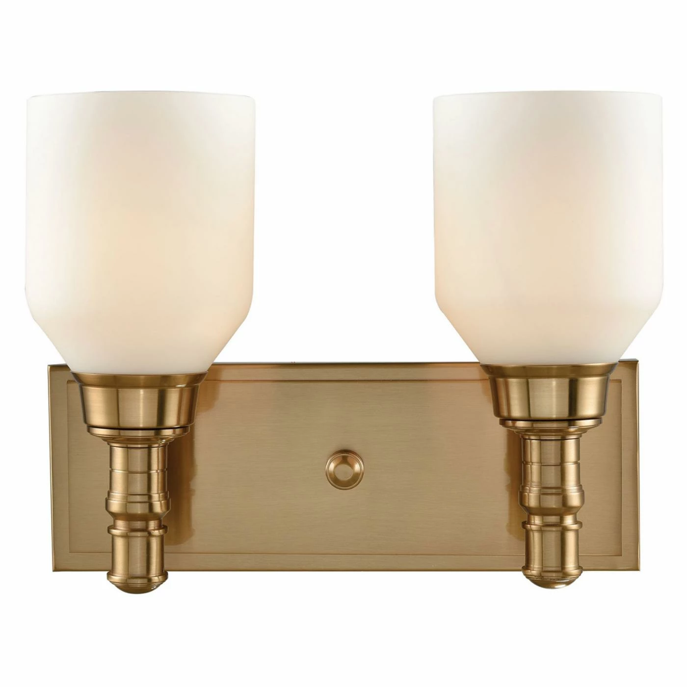 The ELK Lighting 322 Baxter 2 Light Bathroom Vanity Light illuminates your space in classic-chic style with double glass shades in a soft opal white hue. This vanity light features a smooth metal backplate and angled, decorative socket arms in your choice of available finishes to create a customized look.