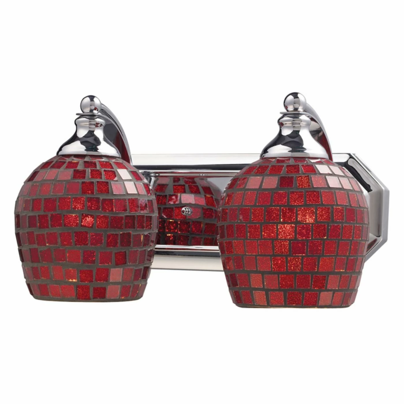 Stunning red mosaic glass shades give the Elk Lighting Bath and Spa 570-2 Bathroom Vanity Light its artistic appeal. The fixture has a beveled backplate, arched arms, and comes in your choice of available finish options. This bathroom vanity light requires two bulbs. It’s offered in your choice of available bulb configuration. Your choice dictates whether the bulbs are included or not.