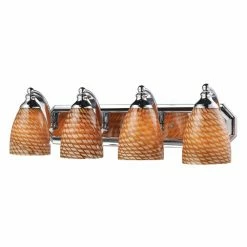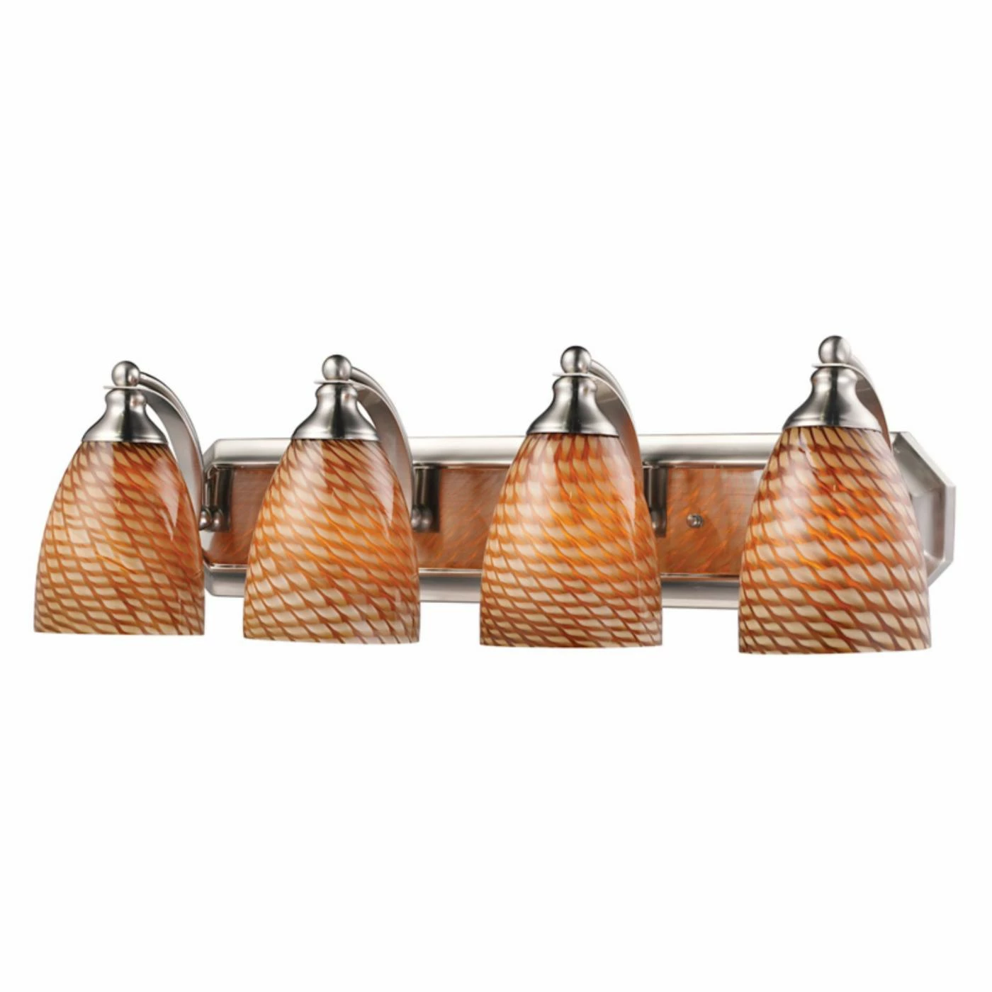 Decadent cocoa brown art glass shades with distinctive patterning give the Elk Lighting Bath and Spa 570-4 Bathroom Vanity Light with Cocoa Glass its warmth. For designer versatility, the fixture has a beveled backplate, arched arms with ball finials, and comes in your choice of available finishes. This bathroom vanity light requires four bulbs and is offered in your choice of available bulb configuration. Your choice dictates whether the bulbs are included or not.