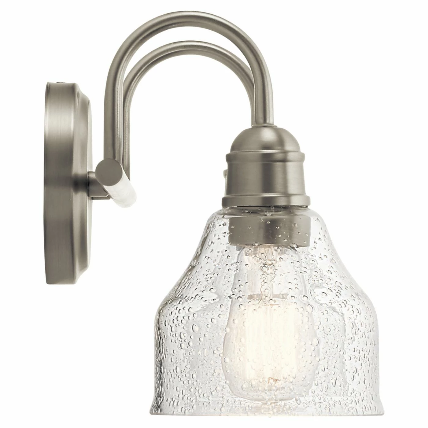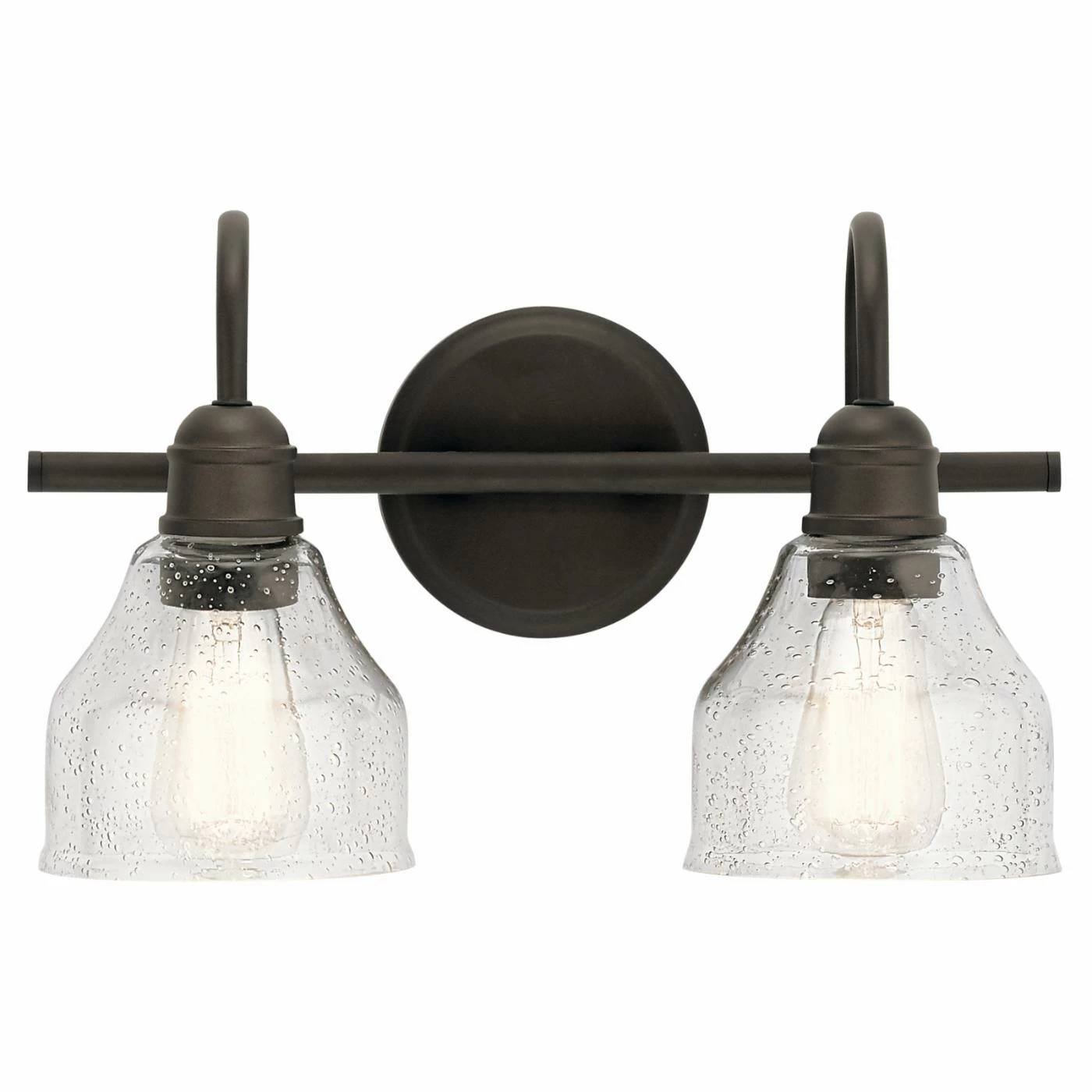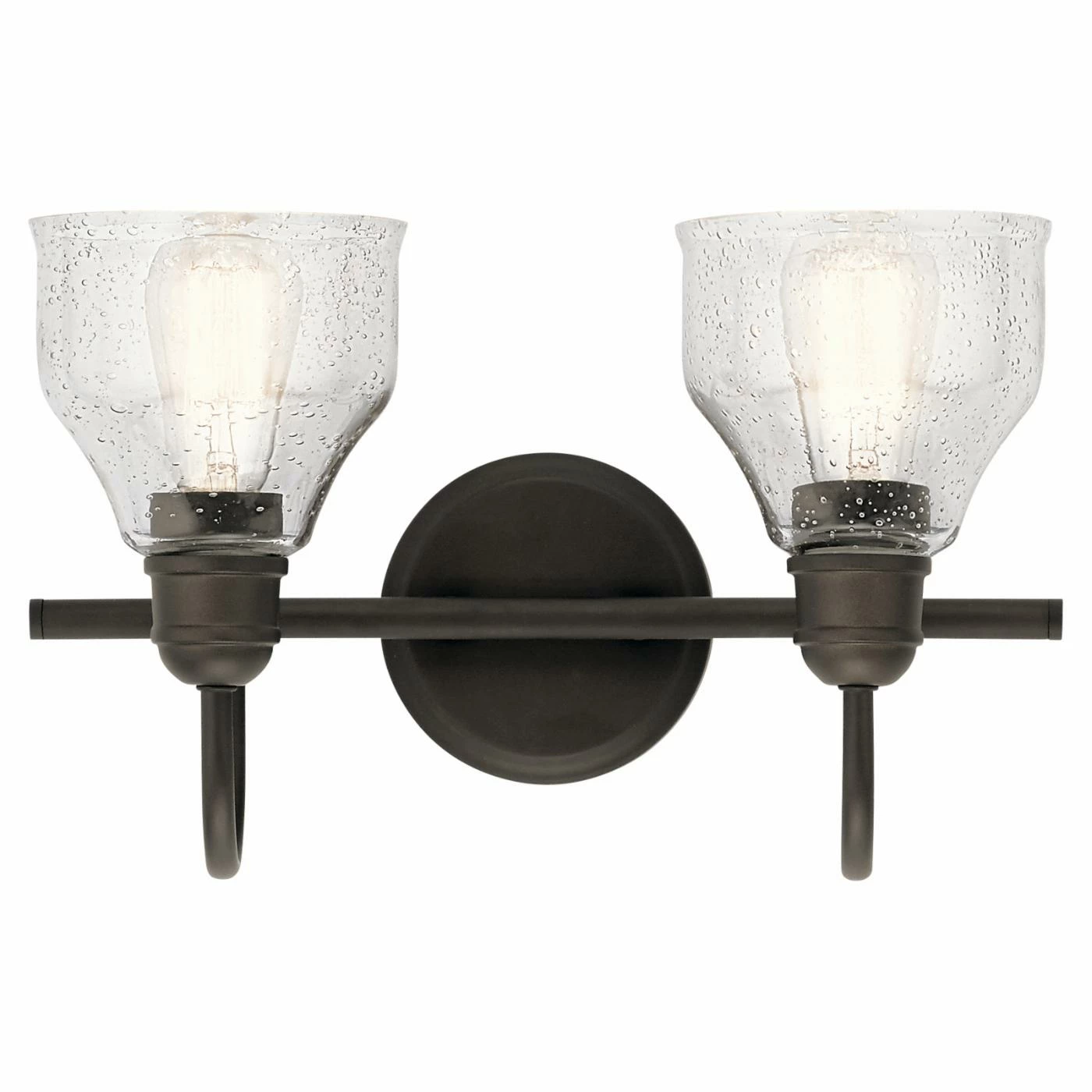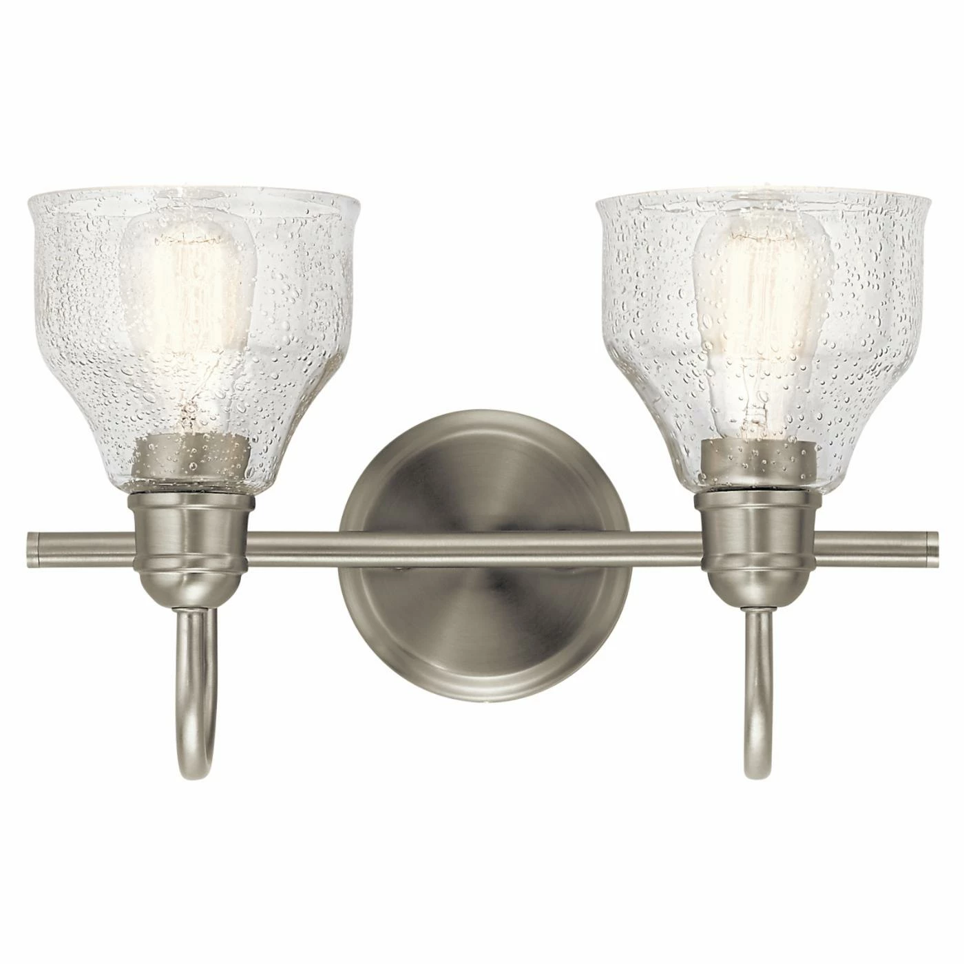 The Kichler Avery 2 Light Bathroom Vanity Light helps provide your bathroom vanity with a vintage-style lighting source. This double-light features a round mounting plate and frame made from durable steel. Wide, round rain glass shades enclose the bulbs. Choose among available finish options. The lights can be installed facing up or down and are damp-rated. Bulbs are not included.