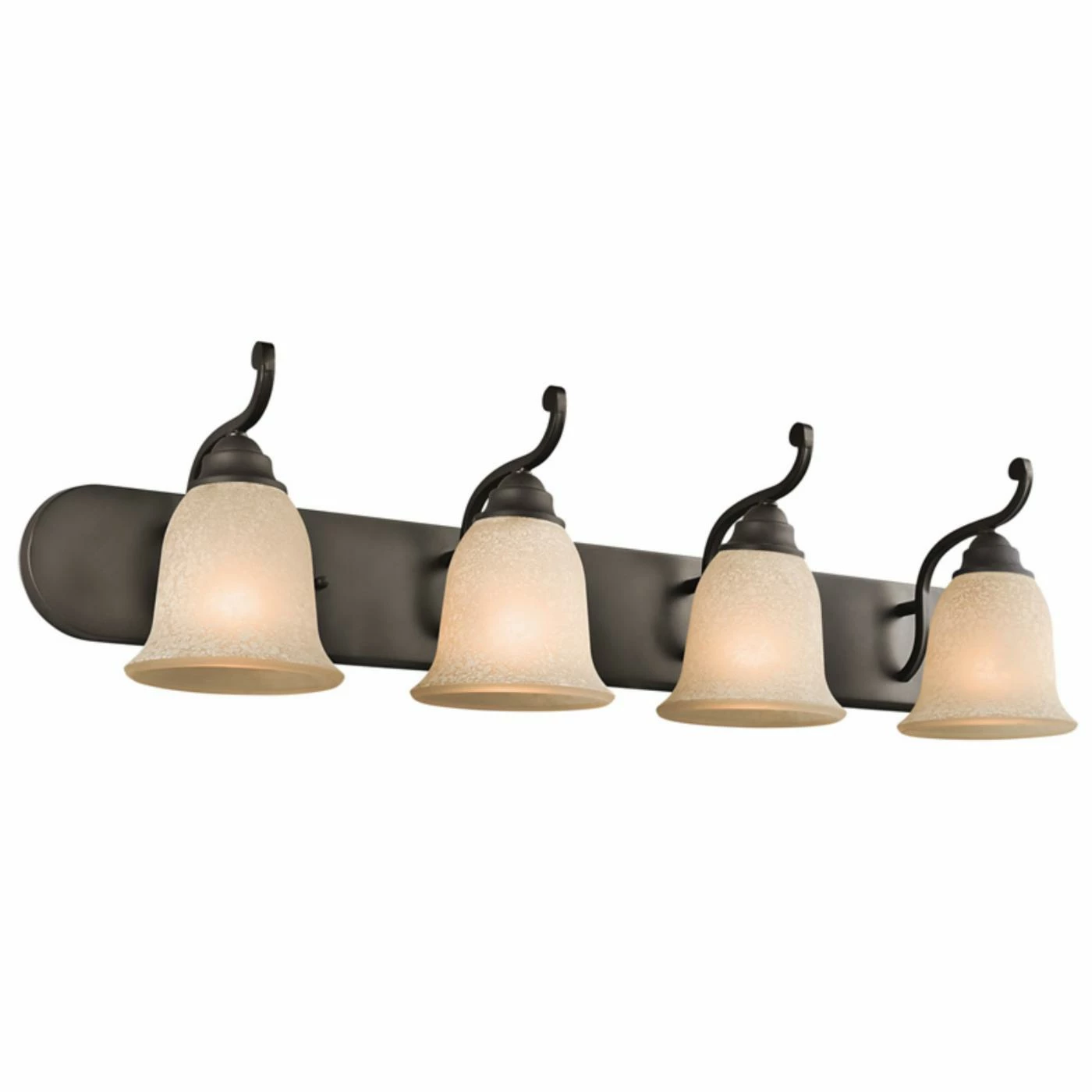 The bathroom decor is about to get a whole lot more delightful because Kichler Camerena 4-light Bath Vanity is simply perfect for your space. The oval metal backplate features scrolled arms, and it can be installed with the lights facing up or down. A rich Olde Bronze finish creates a charming complement to the white scavo glass shades, which have a light umber tinting to create a warm glow. Requires four 100-watt medium base bulbs (not included) and extends 8.25 inches from the wall.