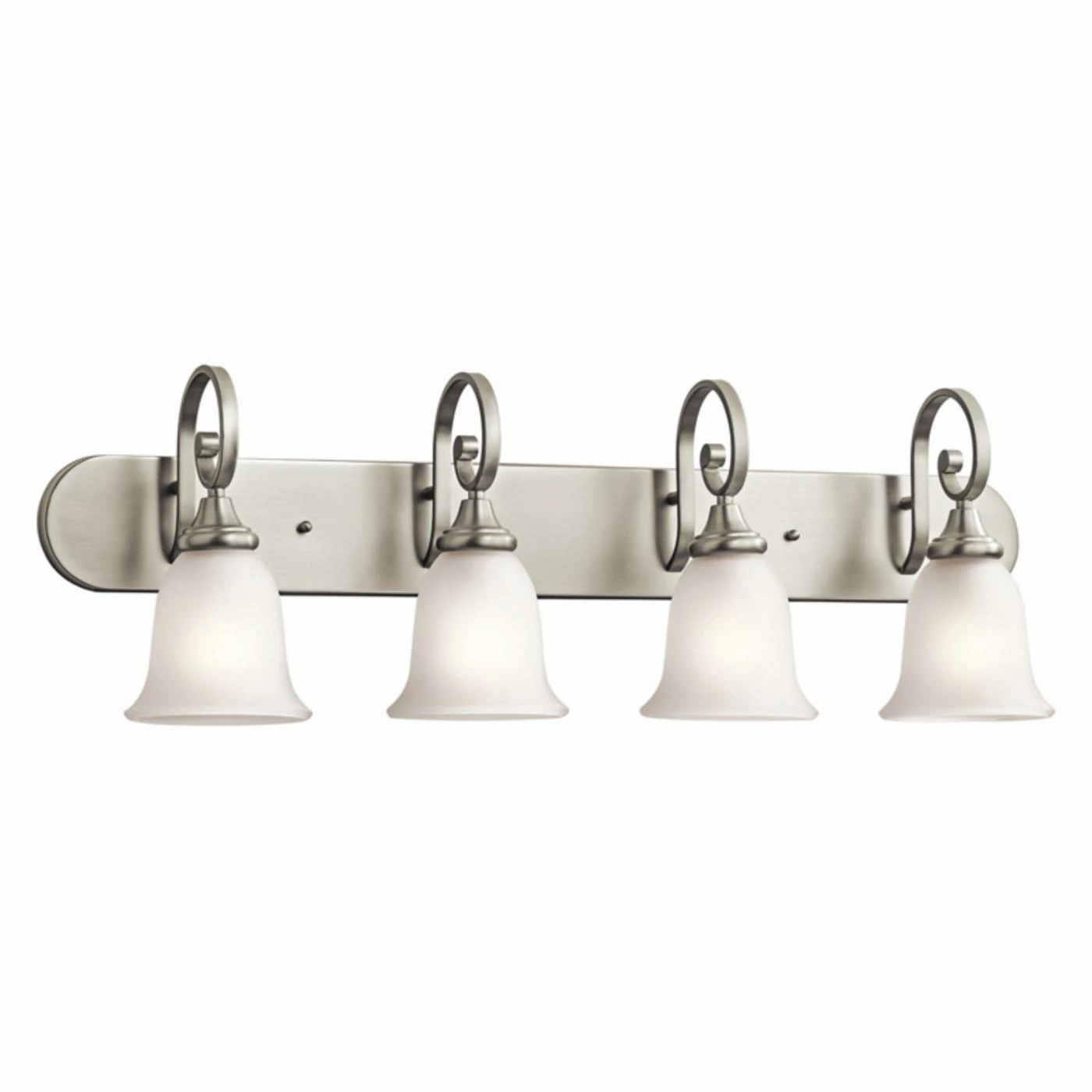 Bring robust light and Americana style home by lighting your bath with the Kichler Monroe 45056L18 Bathroom Vanity Light. It’s classic scrolls are finished in your choice of available color and support light umber etched glass bell shades. This bathroom vanity light is ENERGY STAR rated and requires four 10-watt A19 LED bulbs, which are included.