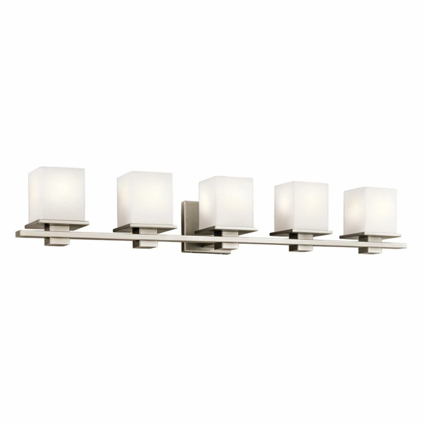The Kichler Tully 45193 5 Light Bathroom Vanity Light is beautiful and well-designed, giving your space an instant face-lift with contemporary style. Clean lines and geometric cubes comprise this modern design. In your choice of available finish and white etched glass shades, this fixture looks great with any dΓ©cor. This bathroom vanity light requires five 100-watt incandescent bulbs (not included).
