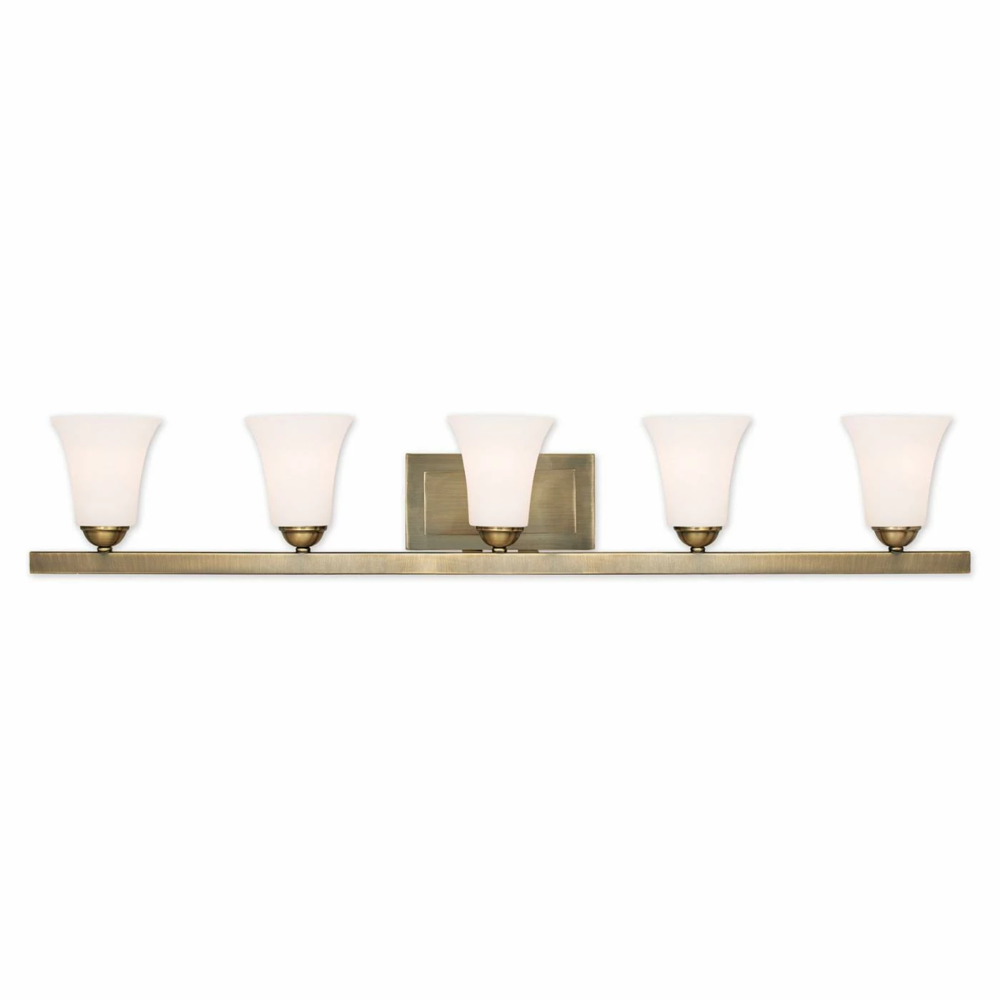 Five 100-watt bulbs keep your vanity well lit with the Livex Lighting Ridgedale 6485 5-Light Bathroom Vanity Light. The opal white glass shades can be oriented upwards or downwards to adjust the lighting. Simple and polished, the base features different finishes so you can select the one that suits your space best.