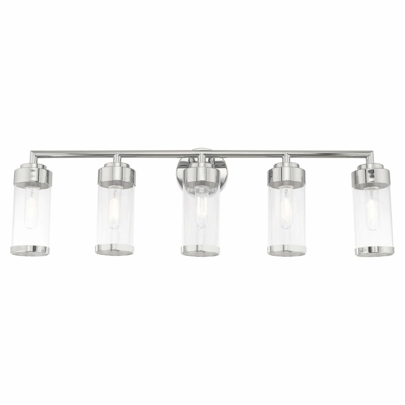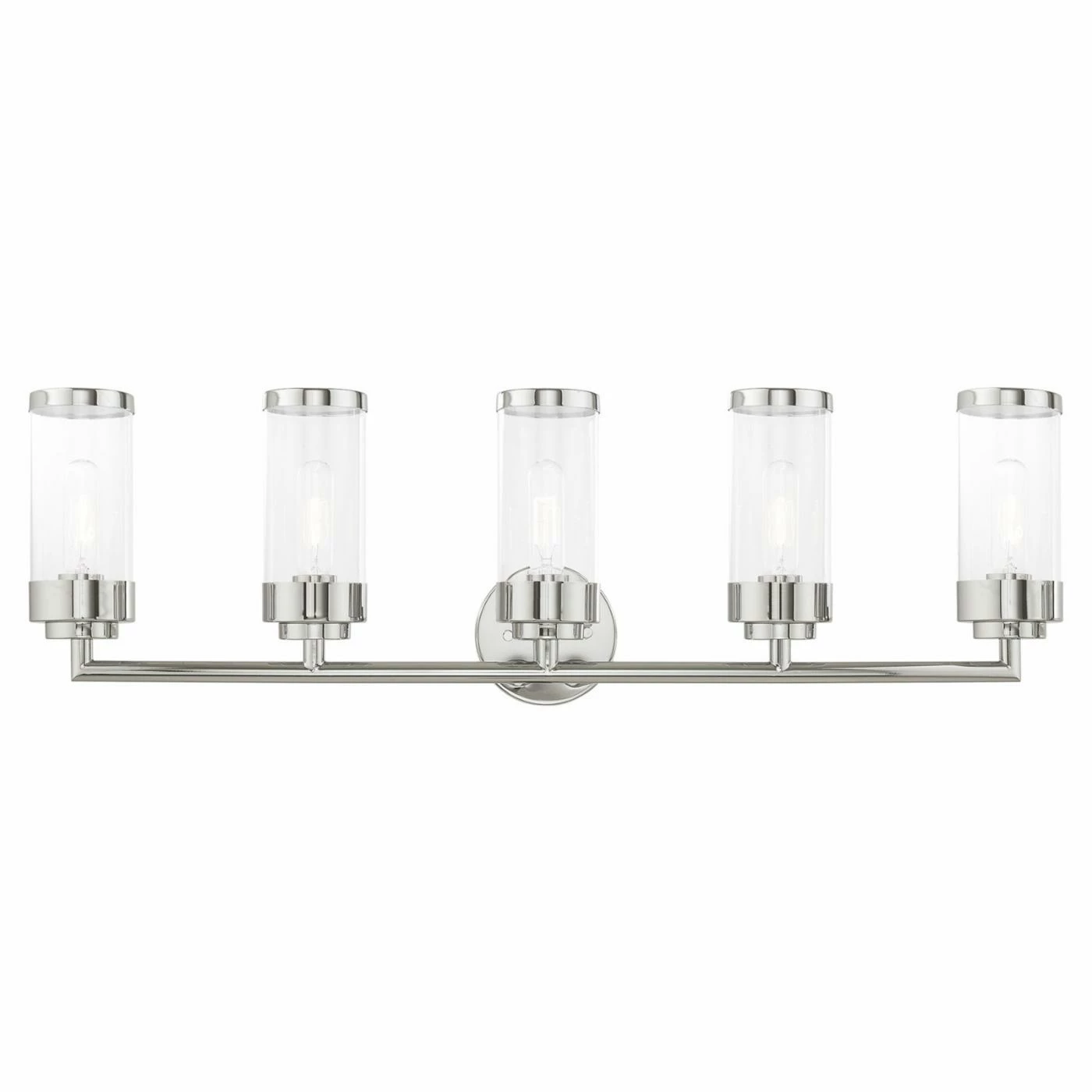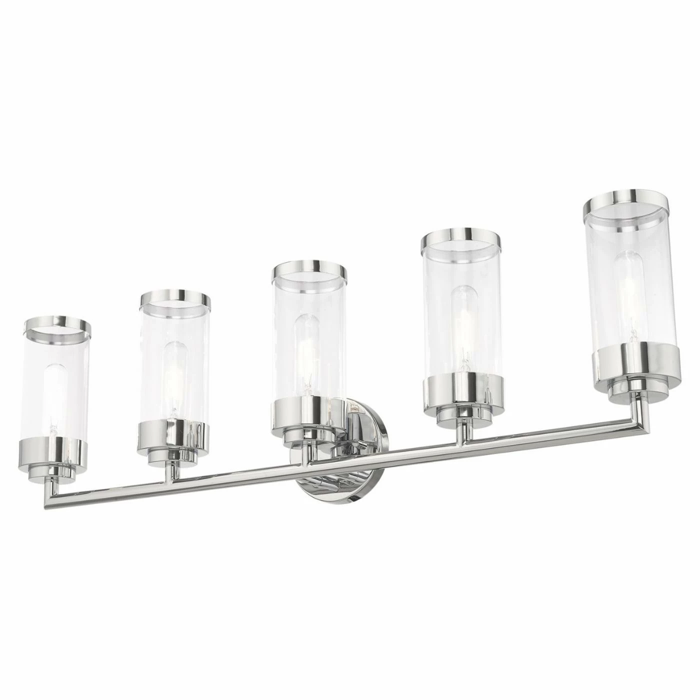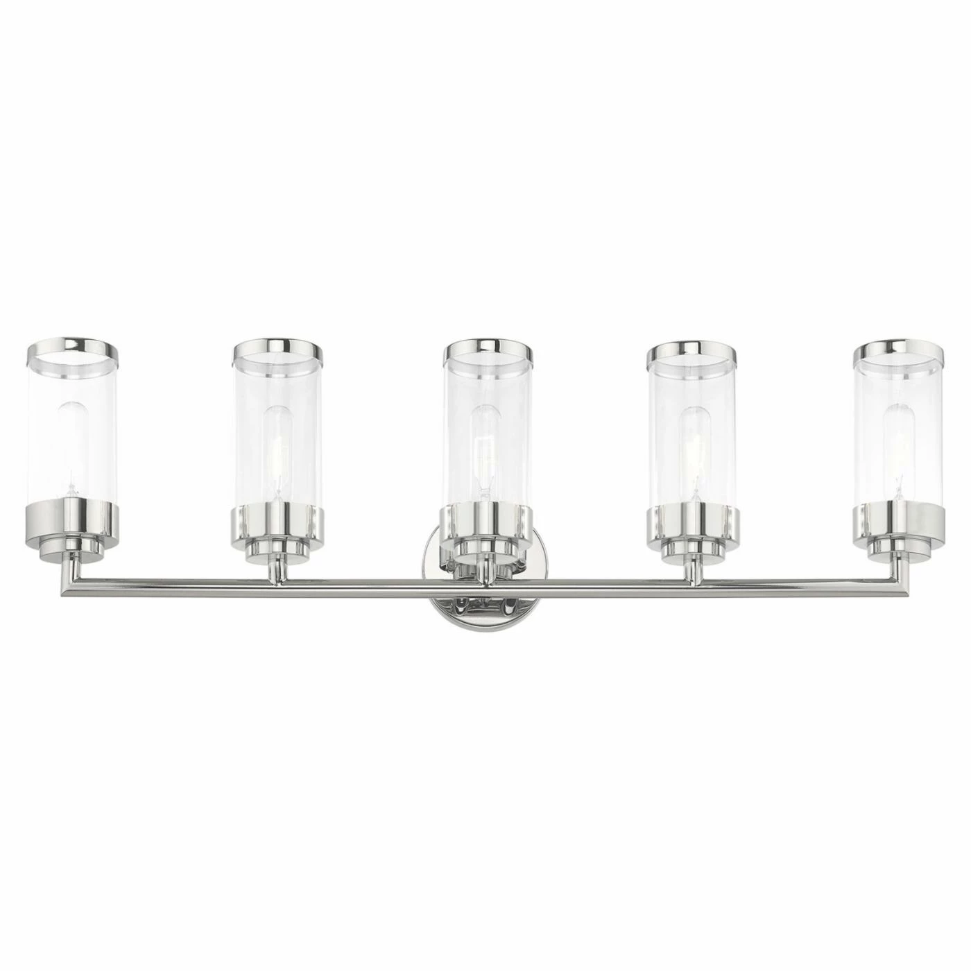 Featuring a clean, modern design, the Livex Lighting Hillcrest 5 Light Bathroom Vanity Light is the perfect way to light up your stylish bathroom. The five clear glass shades are accented by polished chrome rings. This vanity light brings a contemporary sheen to any bathroom. It requires five 100-watt bulbs (not included). Select from the available finish options.