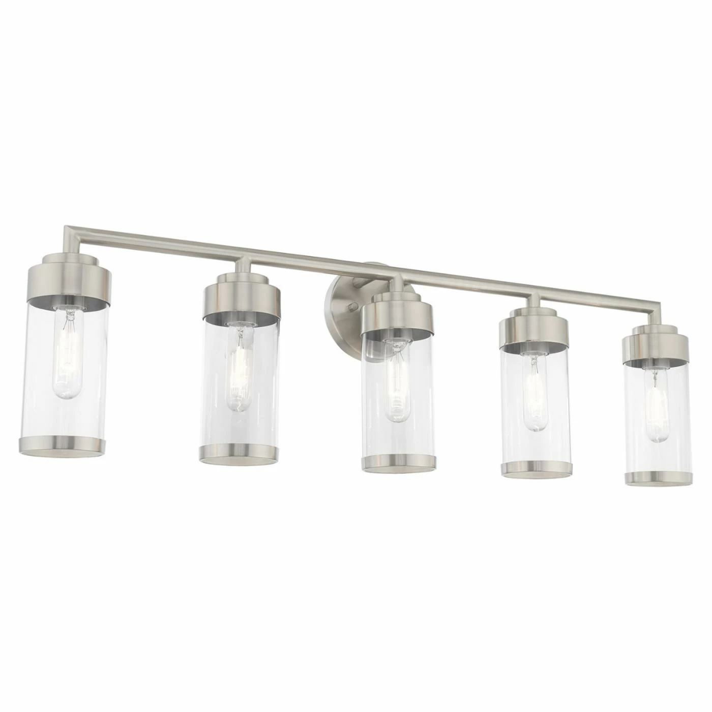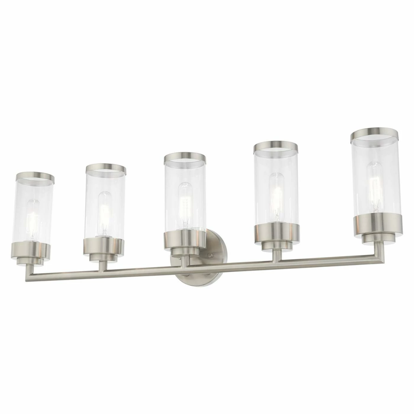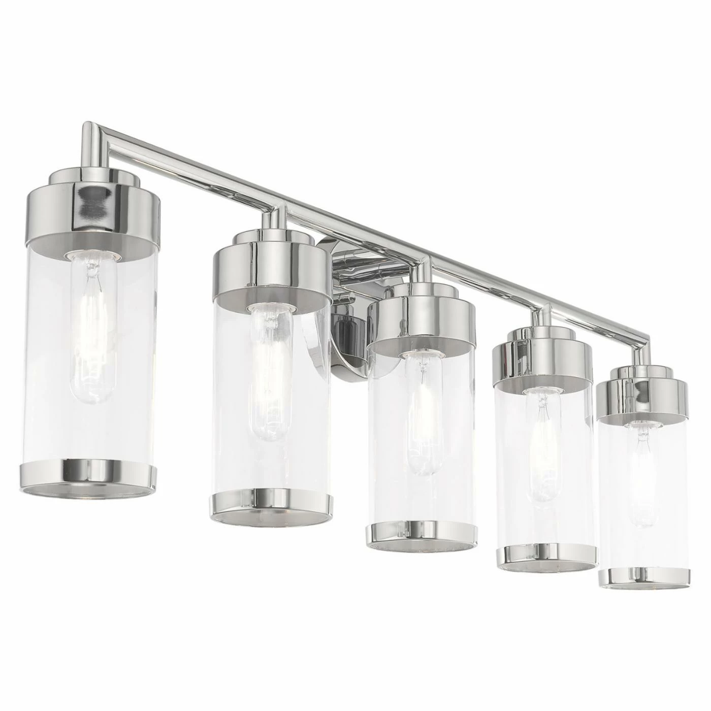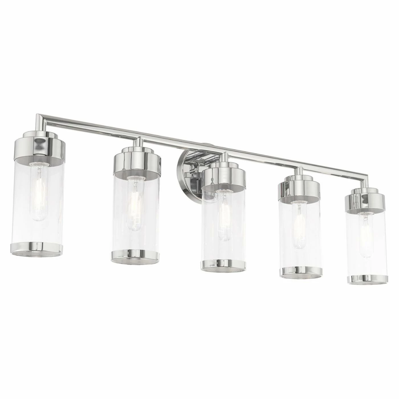 Featuring a clean, modern design, the Livex Lighting Hillcrest 5 Light Bathroom Vanity Light is the perfect way to light up your stylish bathroom. The five clear glass shades are accented by polished chrome rings. This vanity light brings a contemporary sheen to any bathroom. It requires five 100-watt bulbs (not included). Select from the available finish options.