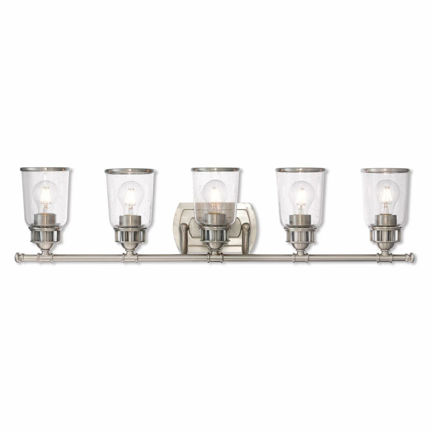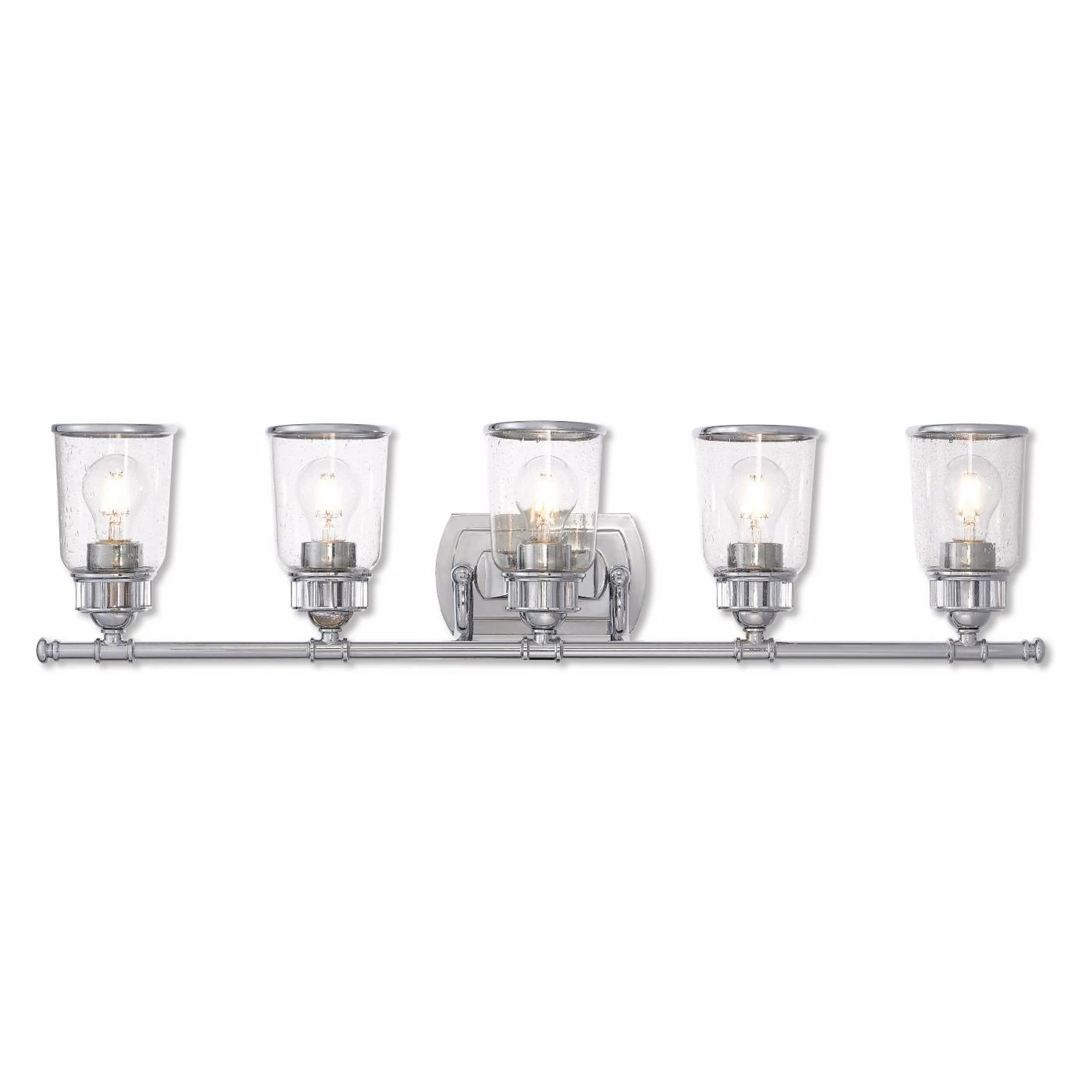 This Livex Lighting Lawrenceville 5 Light Bathroom Vanity Light will bring a note of traditional style to bathroom dΓ©cor. Constructed from sturdy steel, this elegant fixture features five clear glass shades. Be sure to select from our finish choices when placing you order.