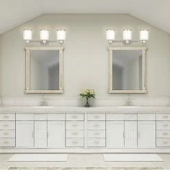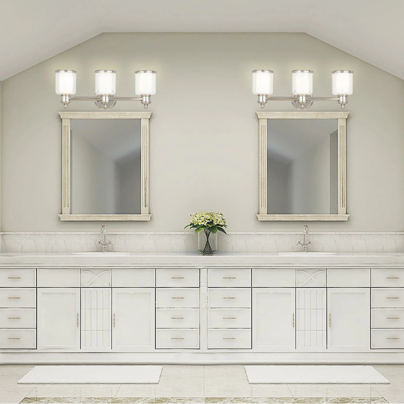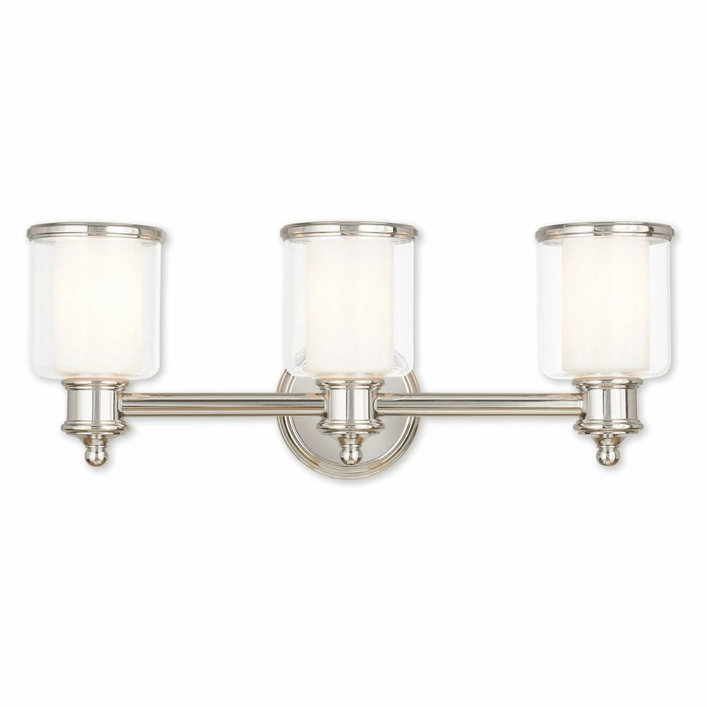 Featuring a satin opal-white glass inside clear glass shade for bright illumination, this Livex Lighting Middlebush 40213 Bathroom Vanity Light is sure to bring brightness and clean design elements to your home’s bathroom. This vanity light requires three 100-watt incandescent bulbs (not included).