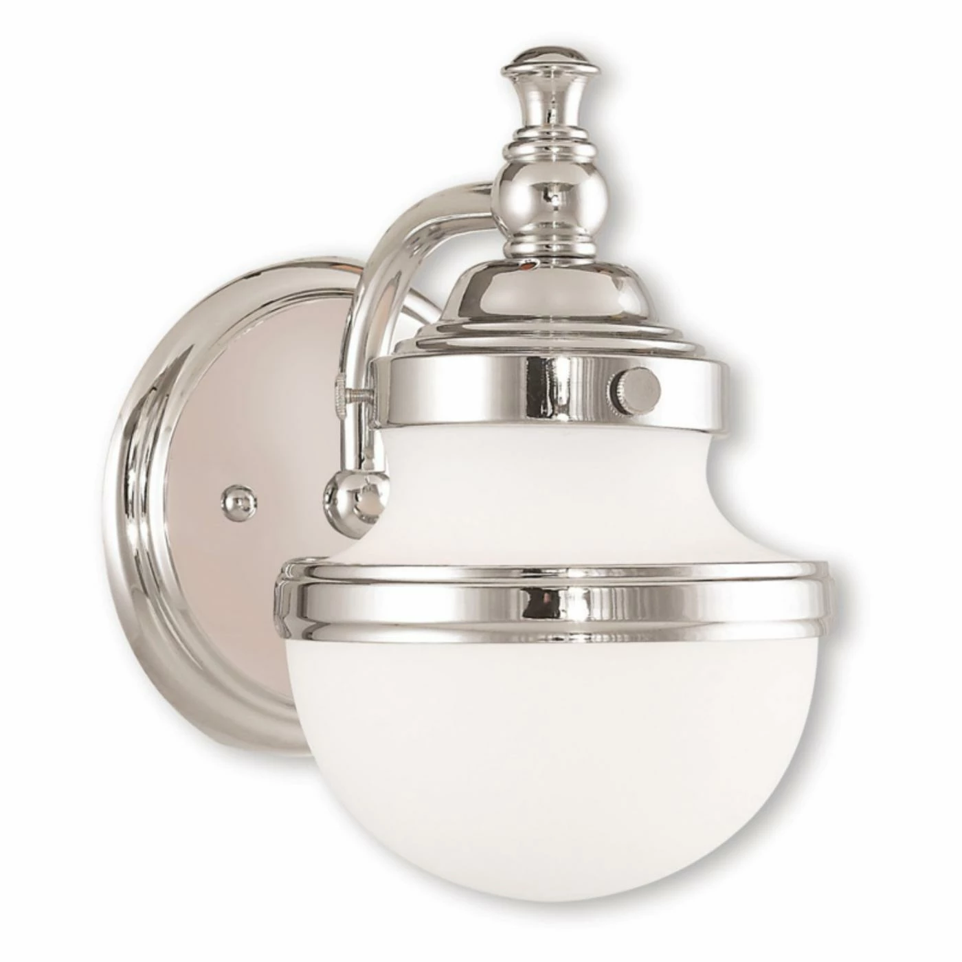 Sleek elements make this Livex Lighting Oldwick 5711-05 Bathroom Vanity Light stand out, including the brilliant chrome finish and satin opal-white glass. This vanity light requires one 75-watt incandescent bulb (not included).