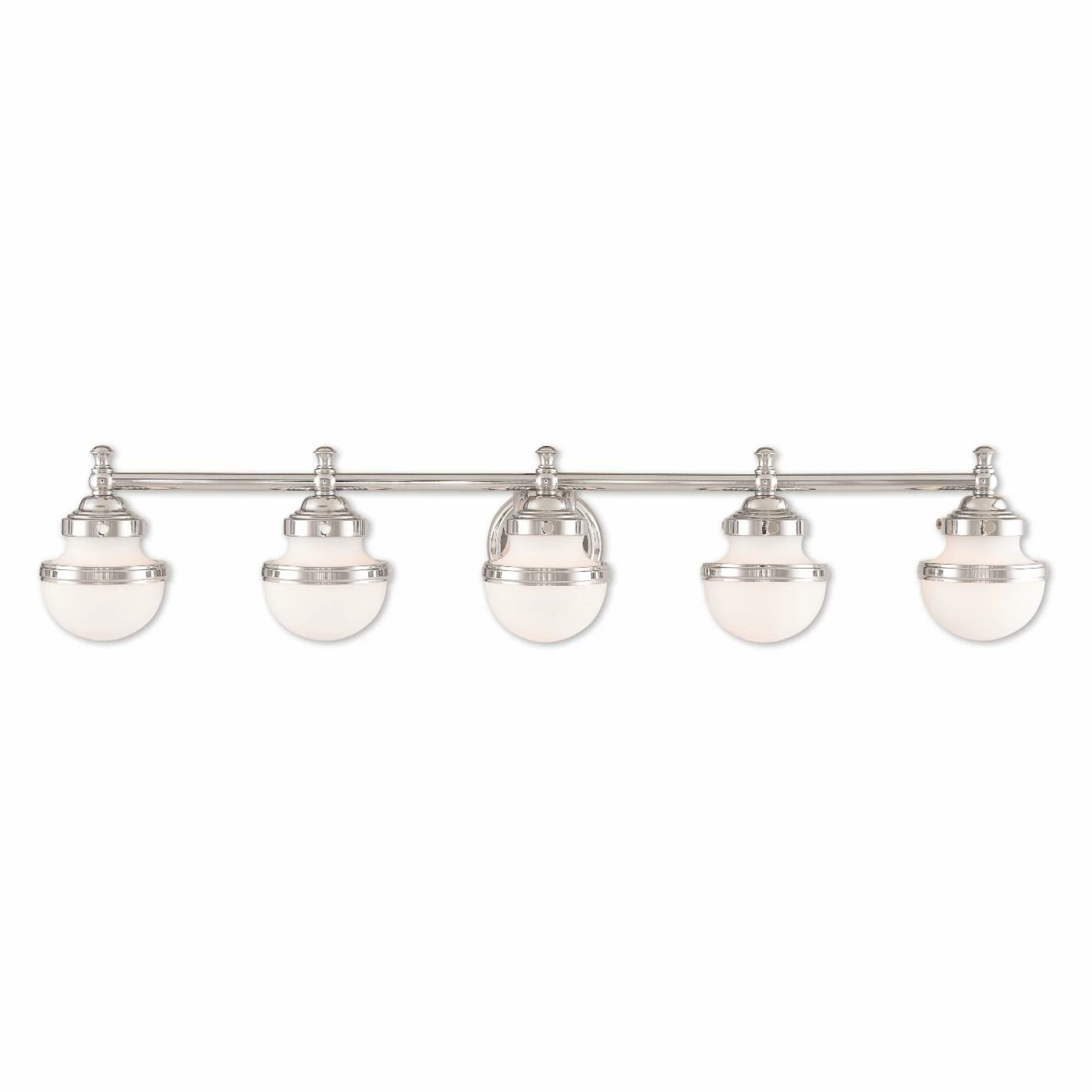 This Livex Lighting Oldwick 5715-05 Bathroom Vanity Light offers stunning illumination, along with a polished chrome finish and satin opal-white glass. This vanity light requires five 75-watt bulbs (not included).