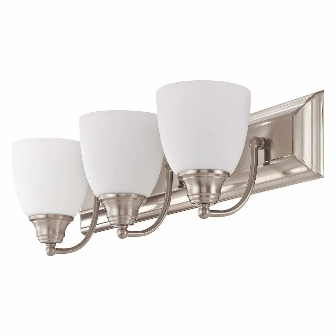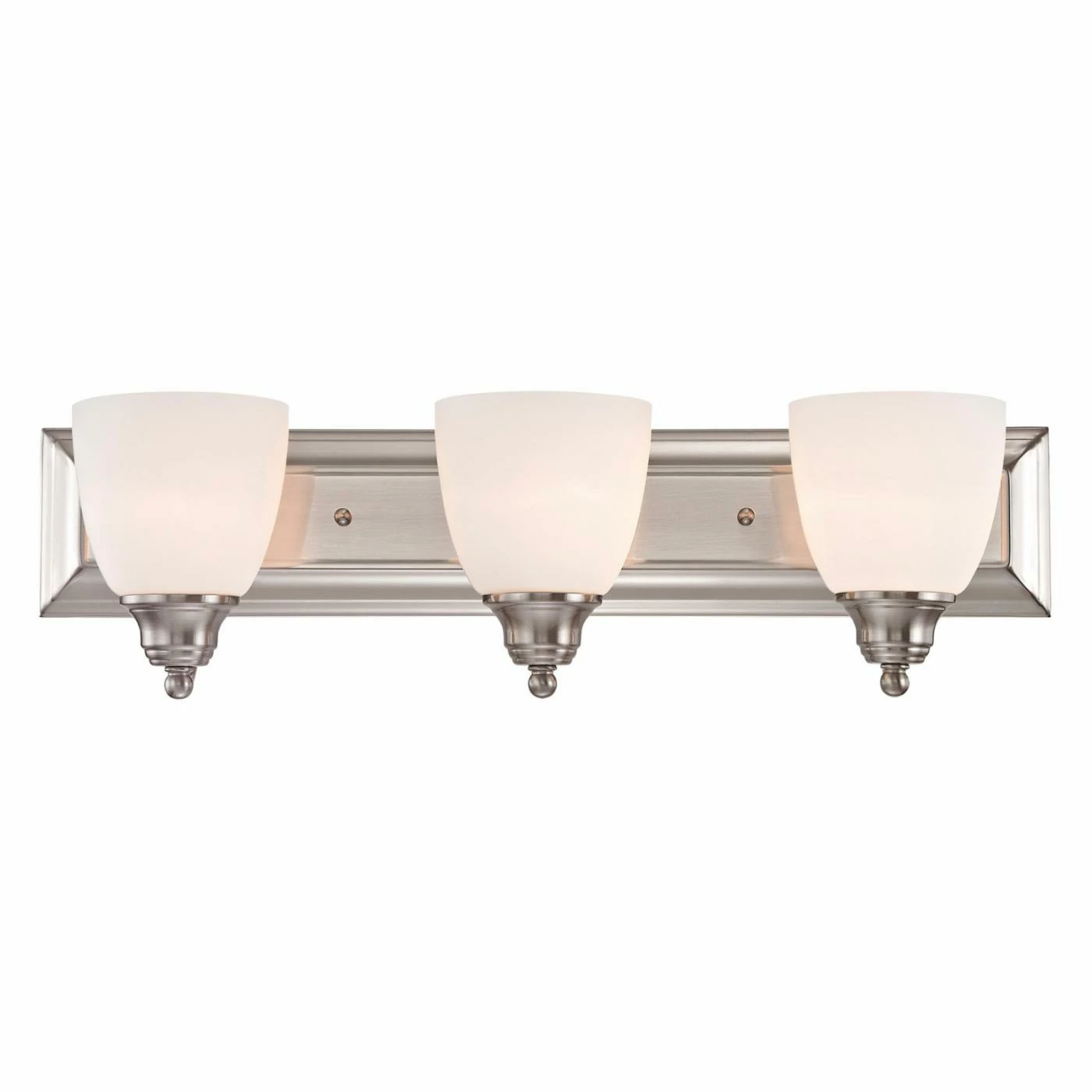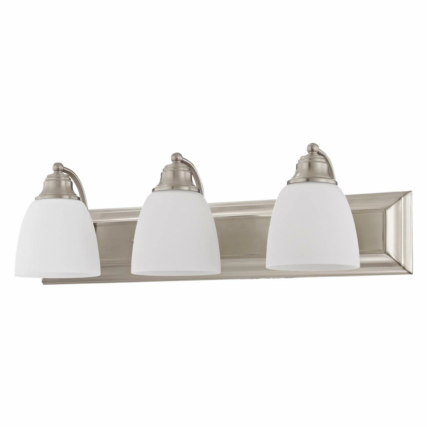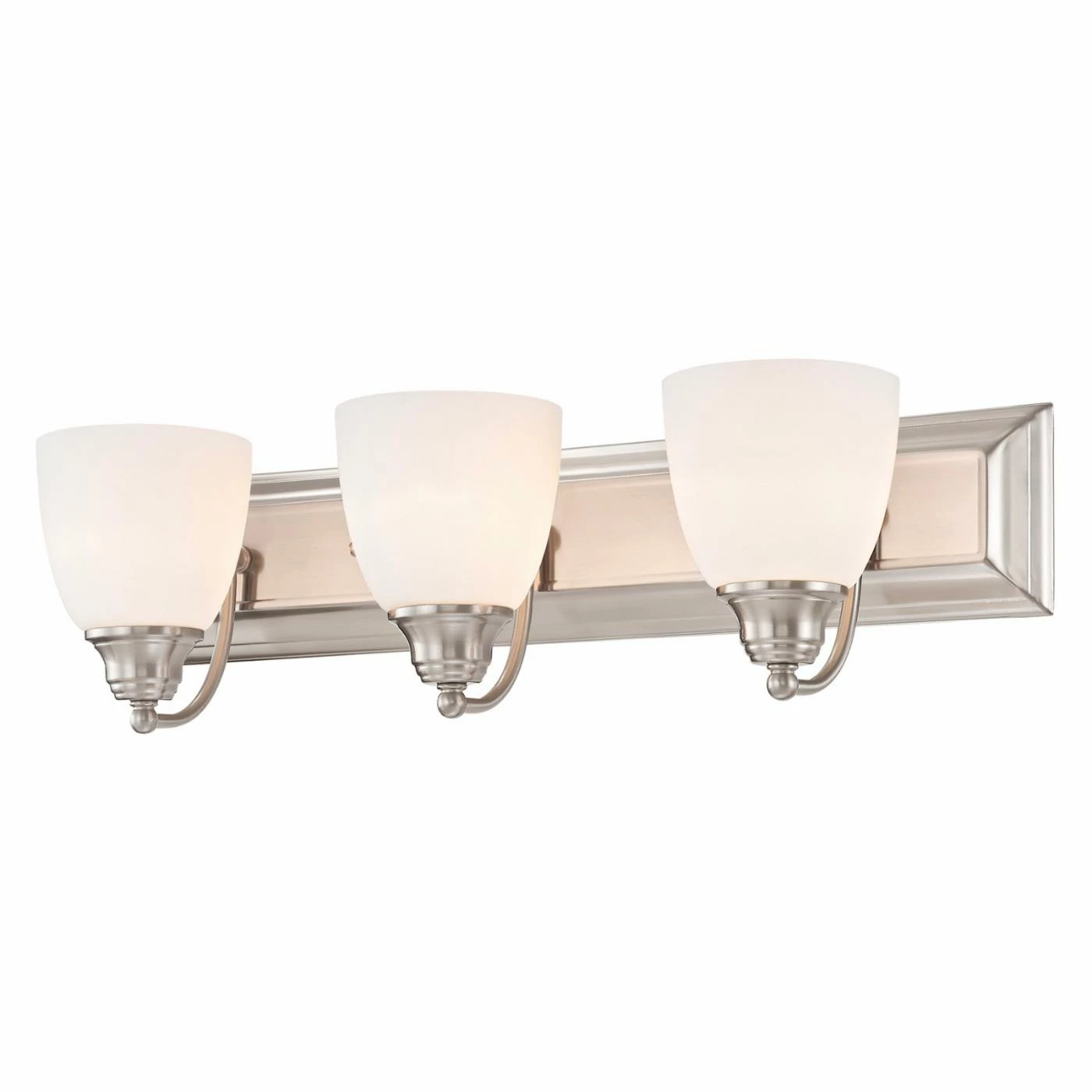 Brilliant construction is evident in this Livex Lighting Springfield 10503-91 Bathroom Vanity Light, which boasts satin opal-white glass and rectangular back plate with a brushed nickel finish. This vanity light requires three 100-watt incandescent bulbs (not included).