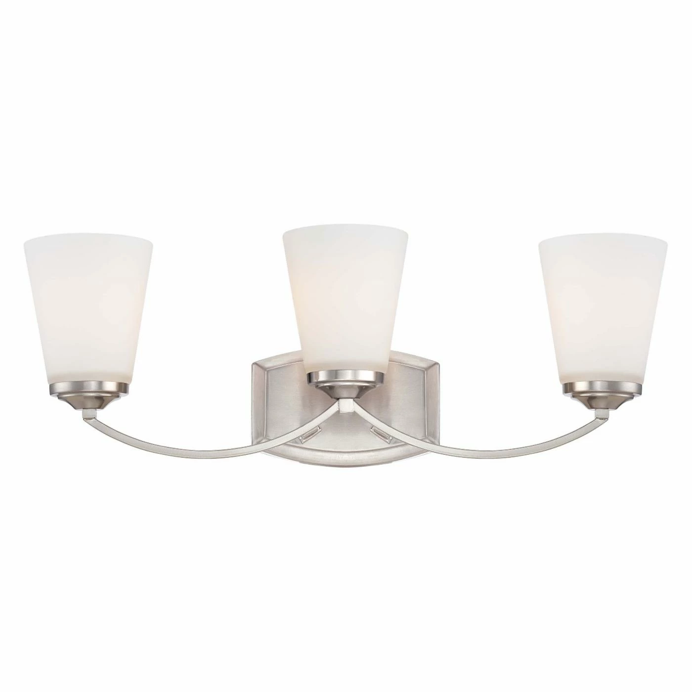 Face the Minka Lavery Overland Park 6963-84 Bathroom Vanity Light upwards to bring more ambient illumination to your modern bathroom or downwards to provide more task lighting at your sink. In either position, the etched opal glass shades diffuse the illumination given off by the three lamps for a pleasing visual effect. The vanity light is fabricated out of durable steel and shows off a sleek, brushed nickel finish.