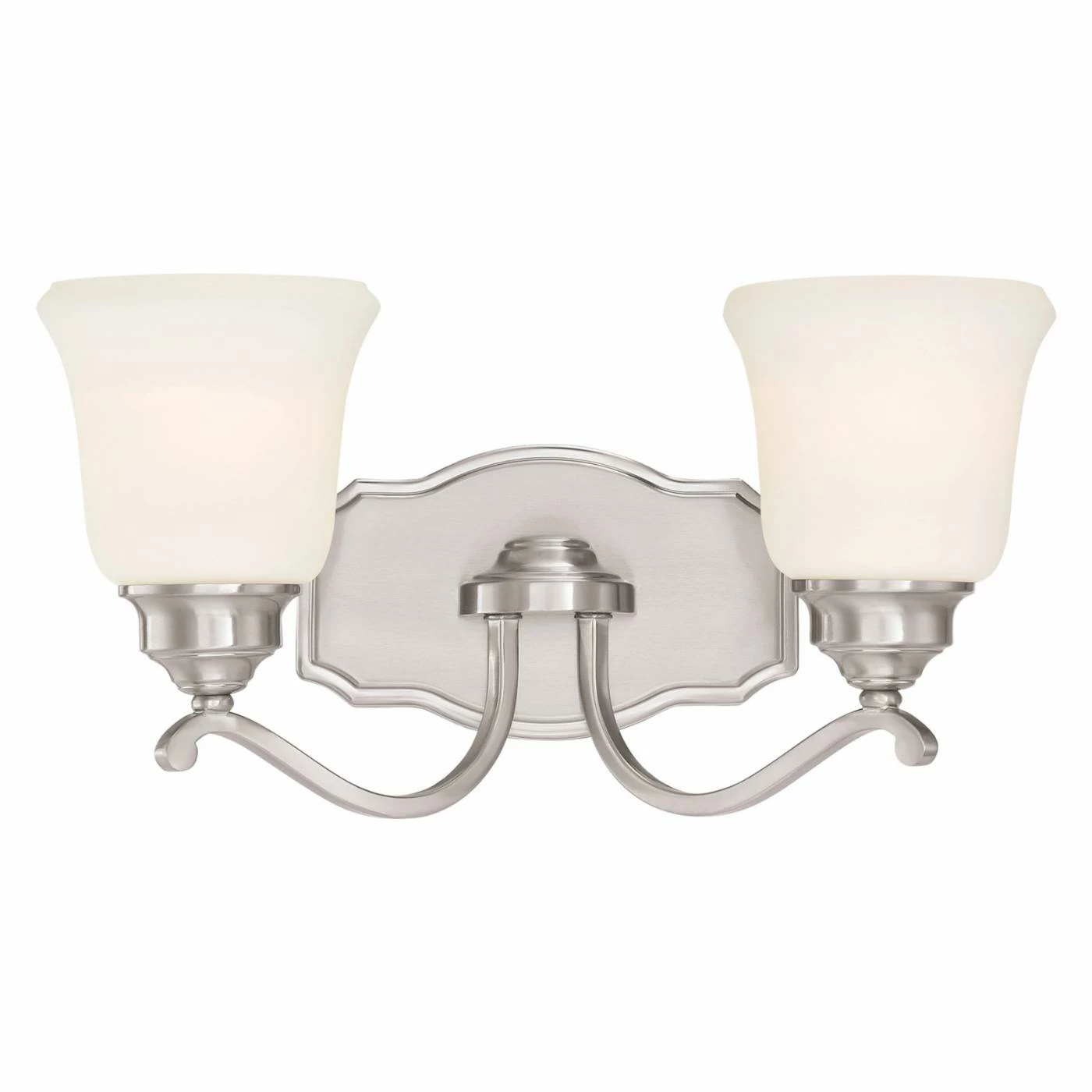 With its elegantly shaped wall mount and dramatically curved arms, the Minka Lavery Savannah Row 3322-84 Bathroom Vanity Light brings graceful appeal to your bathroom. This stylish bathroom vanity light features a brushed nickel finish and two flared white glass shades.