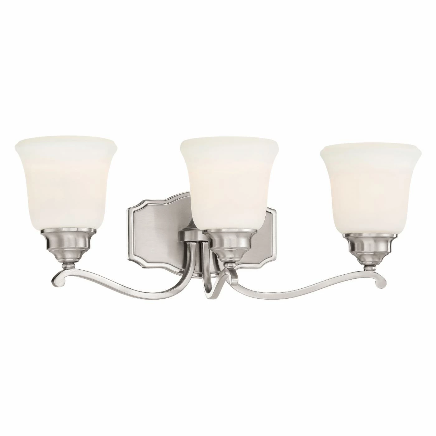 Gracefully designed, the Minka Lavery Savannah Row 3323-84 Bathroom Vanity Light features a curvaceous wall mount and scrolled arms holding three white glass shades. You’ll love the look of this bathroom vanity light with a brushed nickel finish for a modern twist.