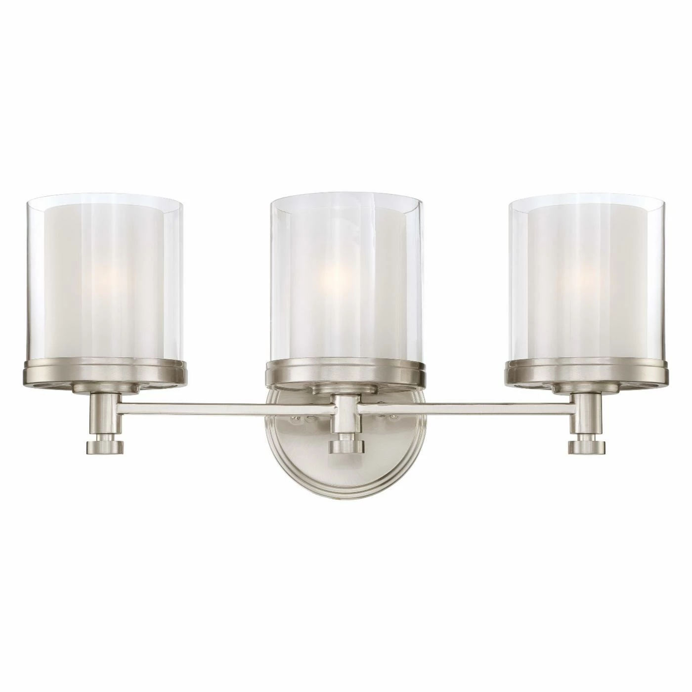 Embrace the classic simplicity of the Nuvo Decker 60/4643 3-Light Vanity – 21.75W in. – Brushed Nickel‘s design. Arms extend from a simple round wall plaque in brushed nickel. Glass shades create a layered look; inner shades are frosted glass, while outer shades are clear. This fixture uses three standard A19 base bulbs.