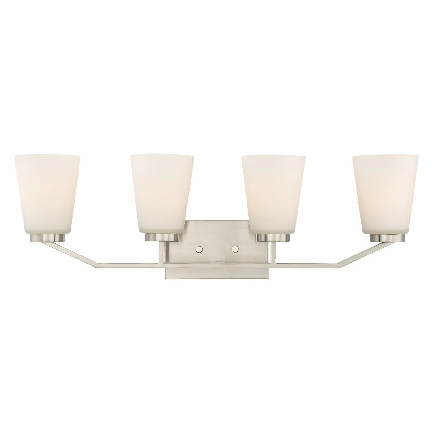 The Nuvo Nome 4 Light Bathroom Vanity Light features multiple lights that span the length of the robust stainless steel arm. Each light is housed in a frosted, light-diffusing globe in a gently tapered design. This fixture can be mounted in an upward or downward position, making it exceptionally versatile.