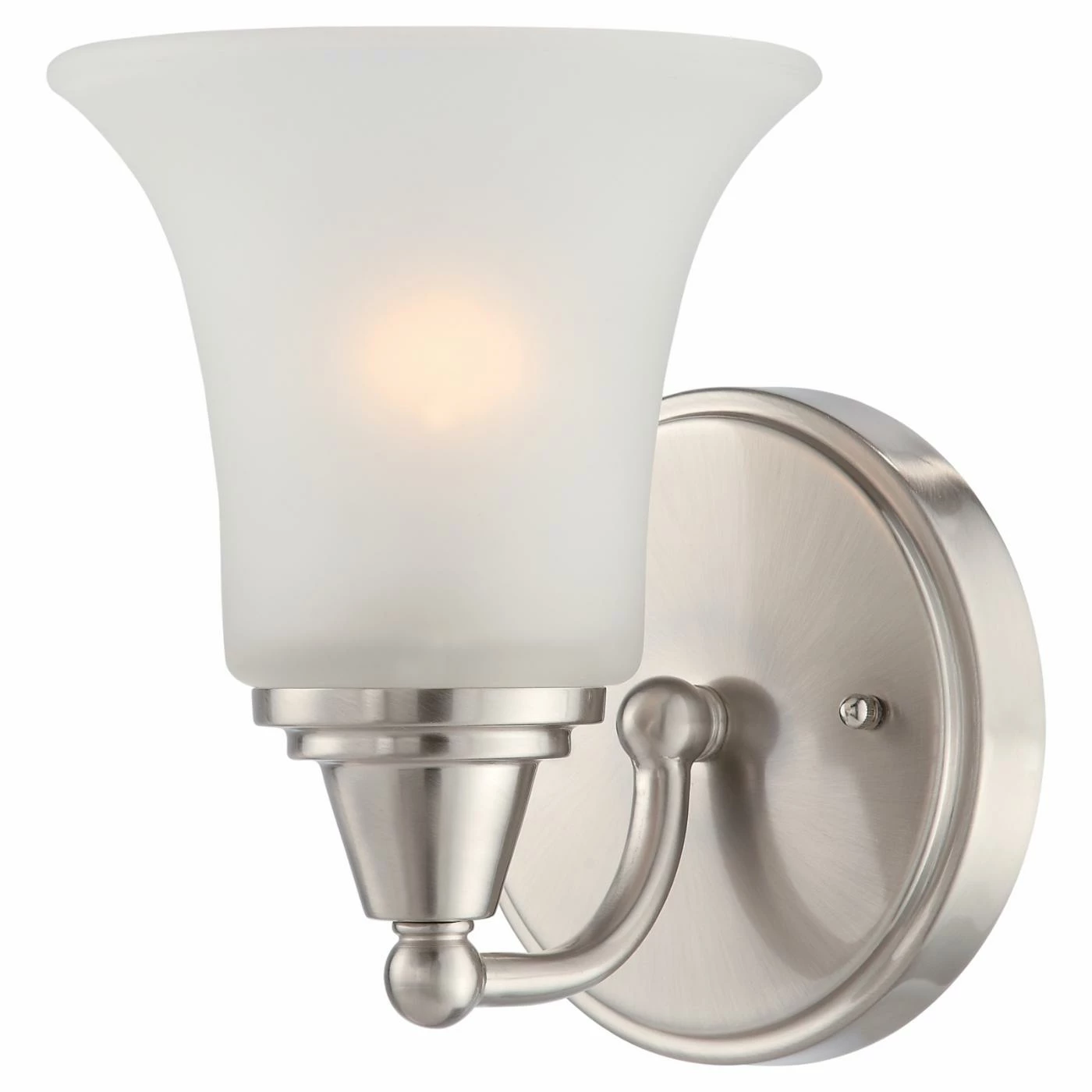 Add an eye-catching touch to your setting with the Nuvo Surrey 60/4141 Bathroom Vanity Light. Constructed from superior-quality materials, this fixture boasts a single upward facing light topped by a frosted glass shade. With its brushed nickel finish, this vanity light is easy to pair with a multitude of decorative schemes.